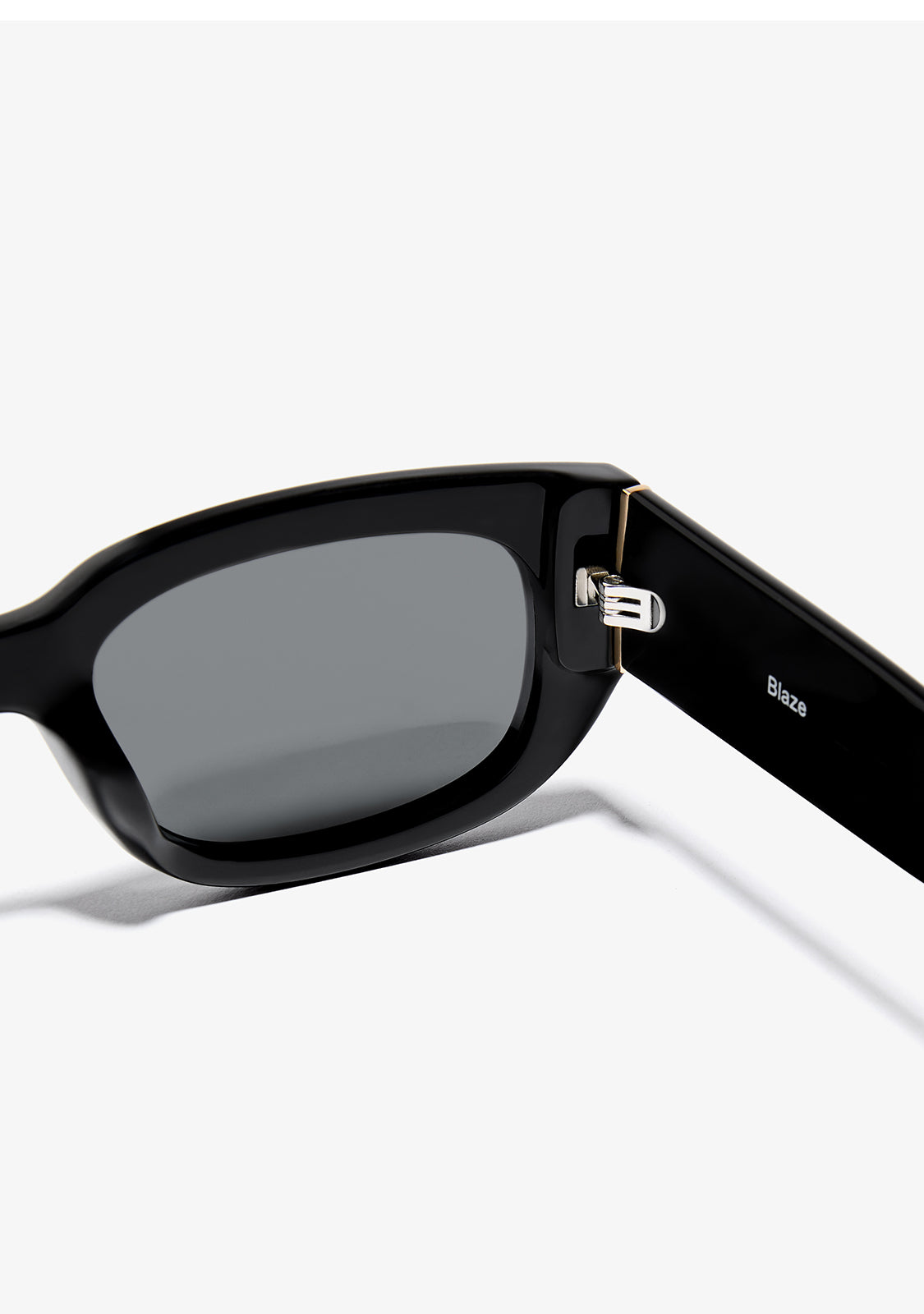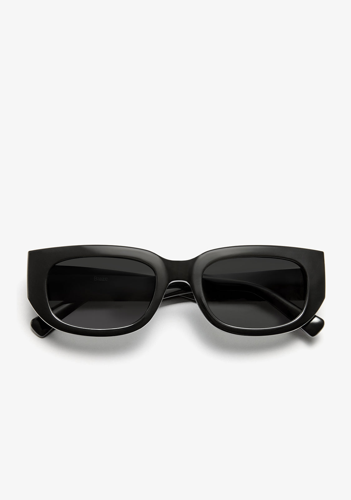 The Blaze Black / Black sunglasses feature a bold rectangular silhouette with a sleek, all-black finish. Inspired by retro shapes and refined with clean lines, they add a confident edge to everyday looks.