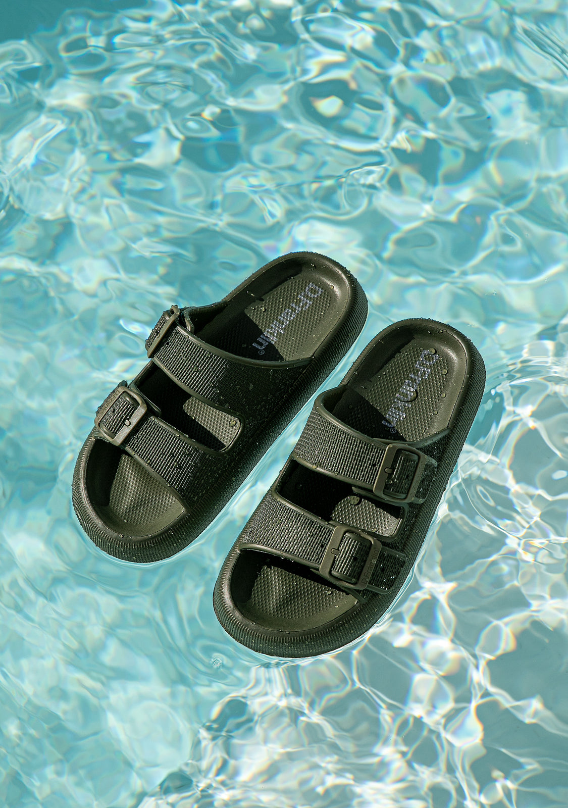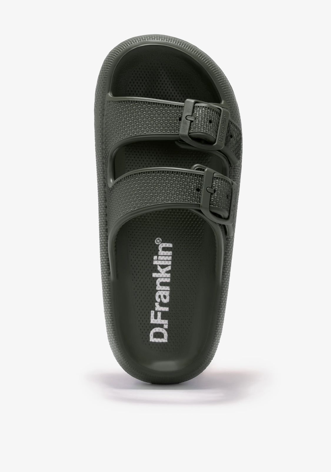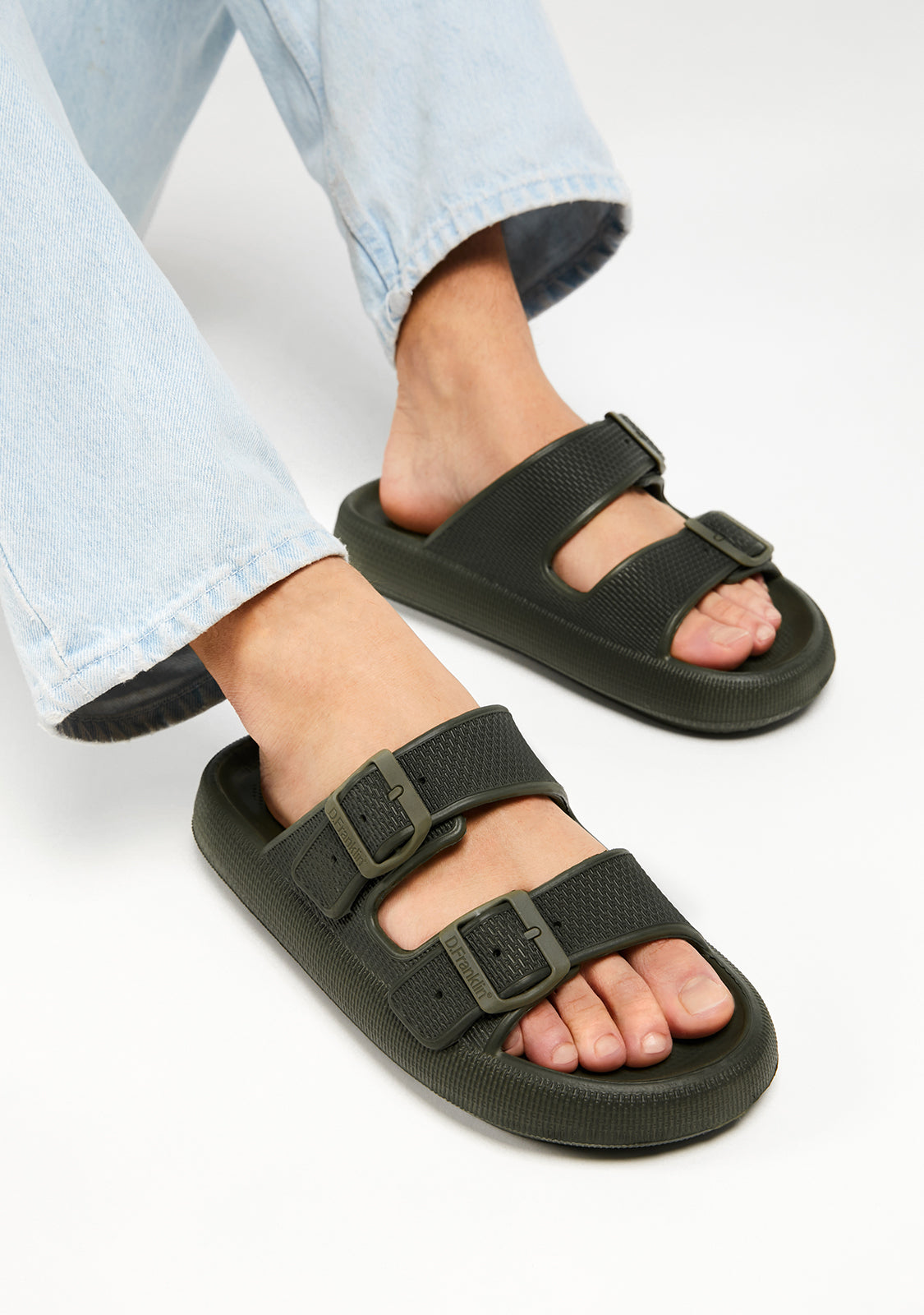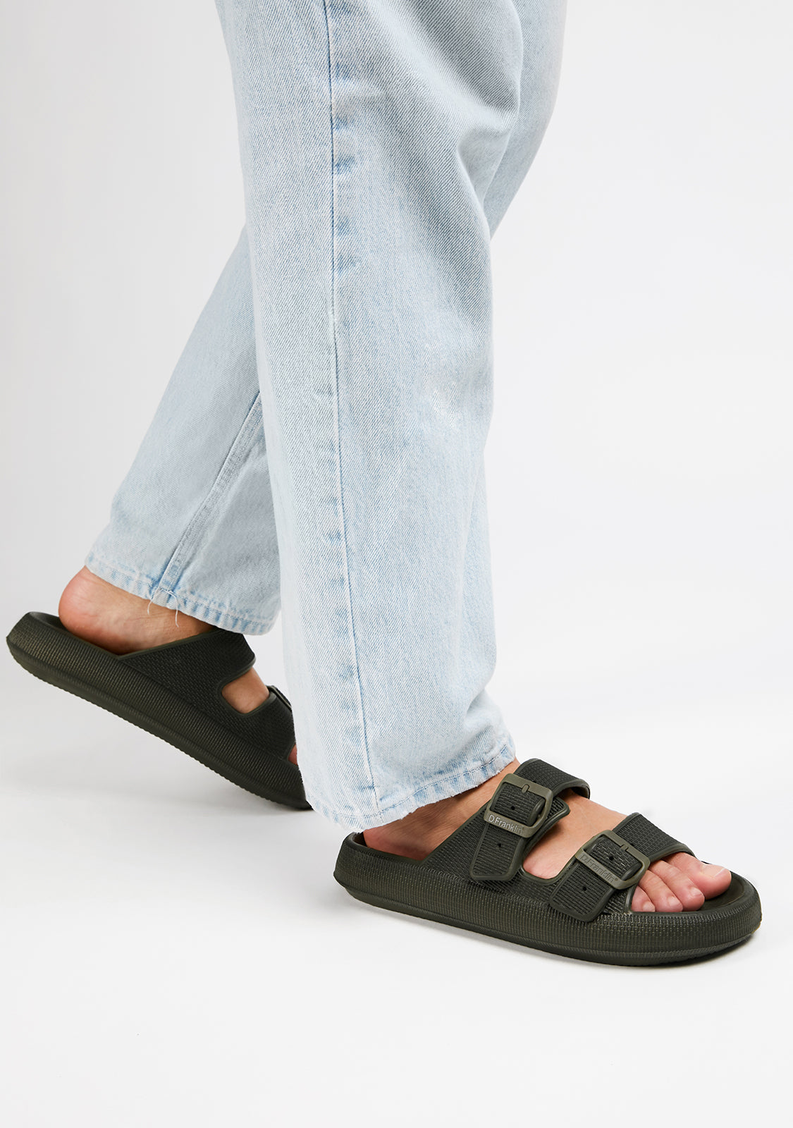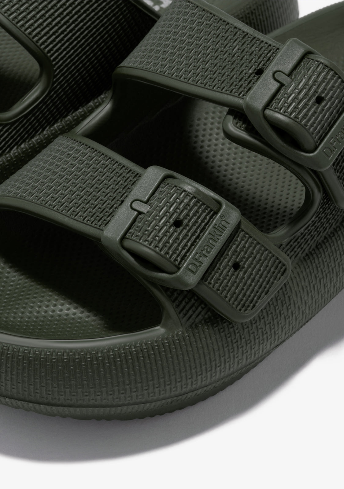 step. Designed with a rounded silhouette and double buckle closure in khaki green. D.Franklin logo on the sole. The Bloomer Bio sandals run slightly small. We recommend choosing one size up from your usual.