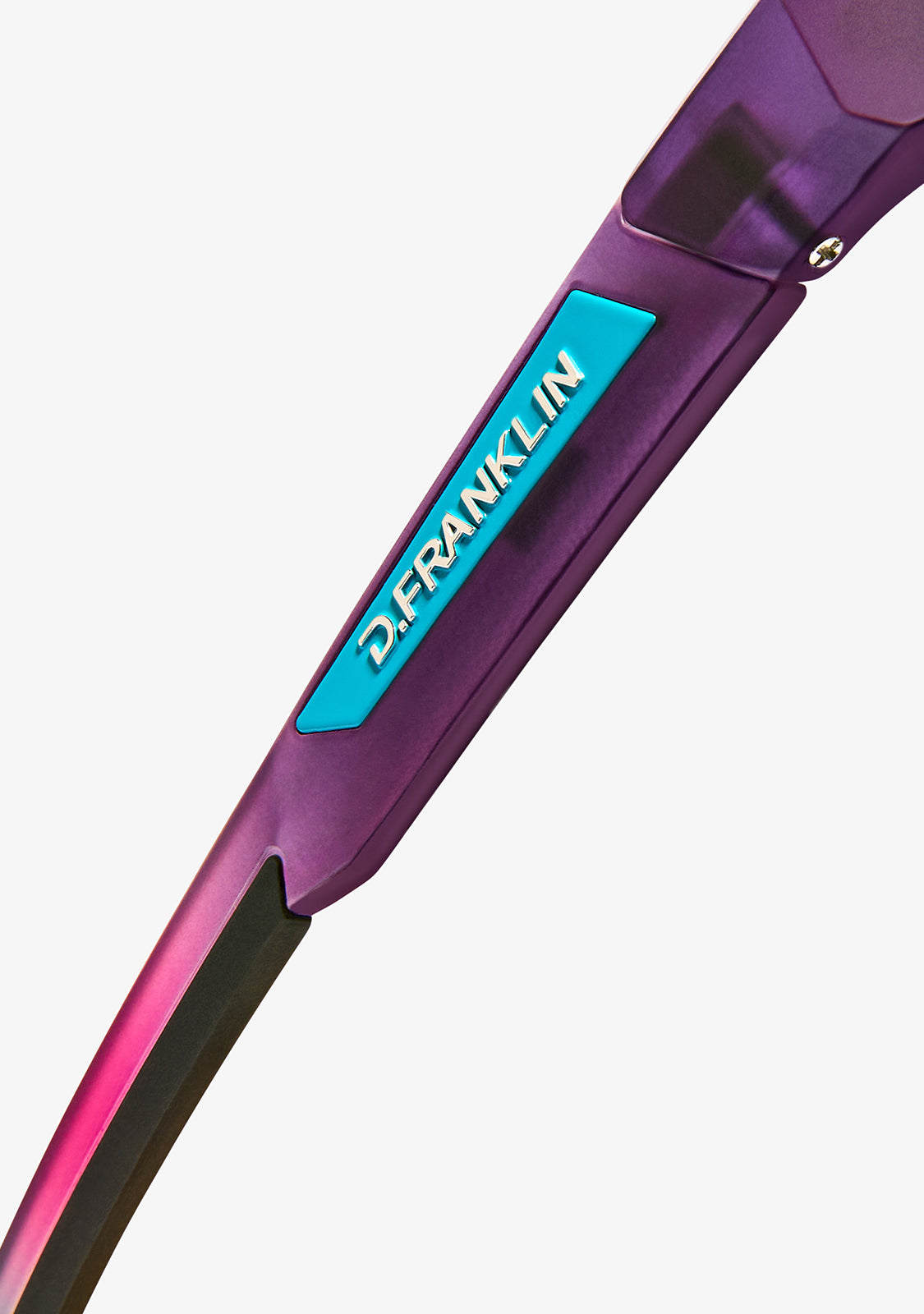 The Hurricane Fifty Grad Aqua / Purple model stands out for its aerodynamic frame and distinctive finish. It features a 152 mm front and 142 mm lenses, precisely designed to optimize airflow and reduce wind resistance. The 130 mm temples display our emblem on both sides, while silicone pads on the tips and nose bridge ensure a secure, comfortable grip.