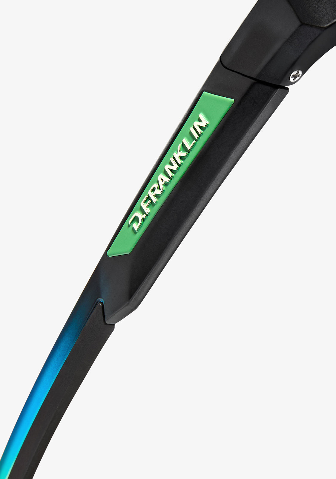 The Hurricane Fifty Grad Green / Green model stands out for its aerodynamic frame and distinctive finish. It features a 152 mm front and 142 mm lenses, precisely designed to optimize airflow and reduce wind resistance. The 130 mm temples display our emblem on both sides, while silicone pads on the tips and nose bridge ensure a secure, comfortable grip.