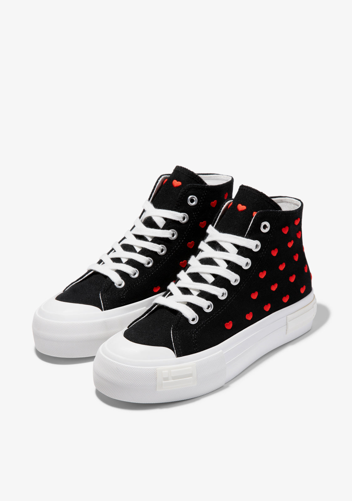 This One Way model is made of canvas textile with a dark design of embroidered hearts. White rubber sole and personalised lettering on the heel. It has a height of 4 cm and features our flag emblem on the side.