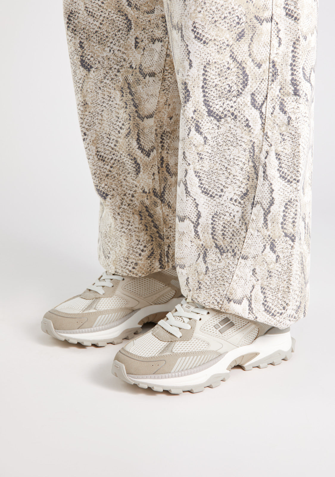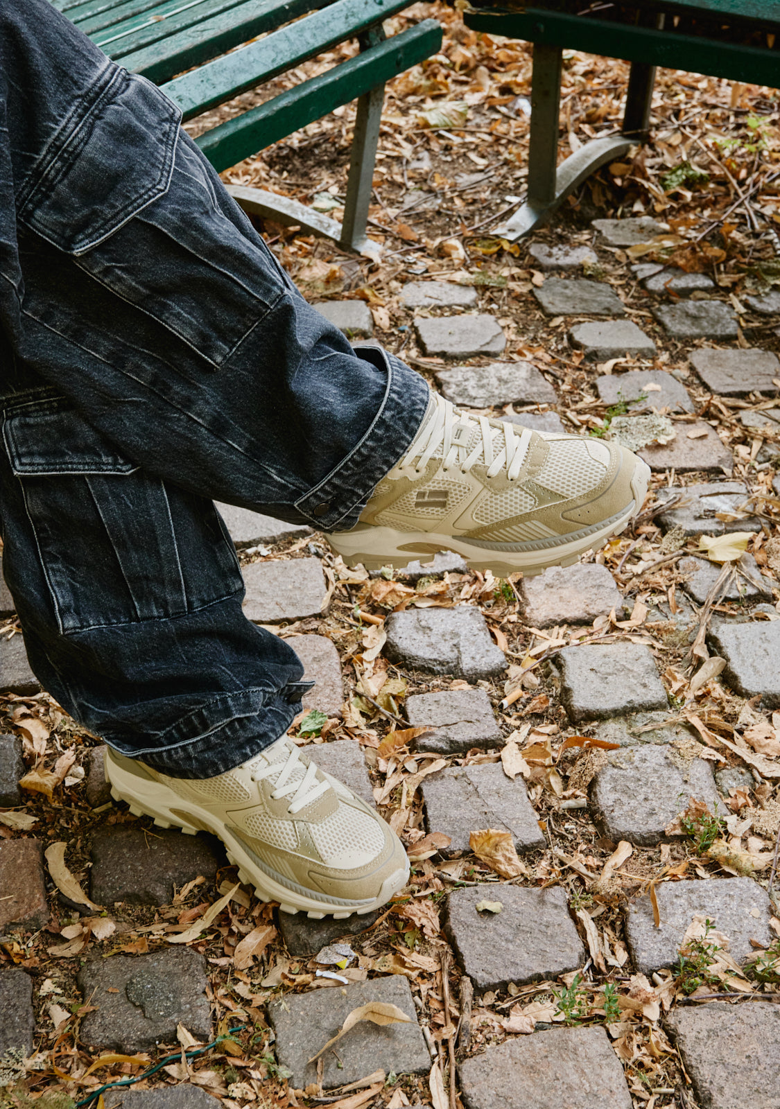 Il nostro modello 347 presenta un'estetica chunky. La sua rete in nylon ad alta densità si combina con diverse finiture e tonalità beige. Mostra la nostra bandiera su un lato e presenta anche una chiusura con lacci regolabile.