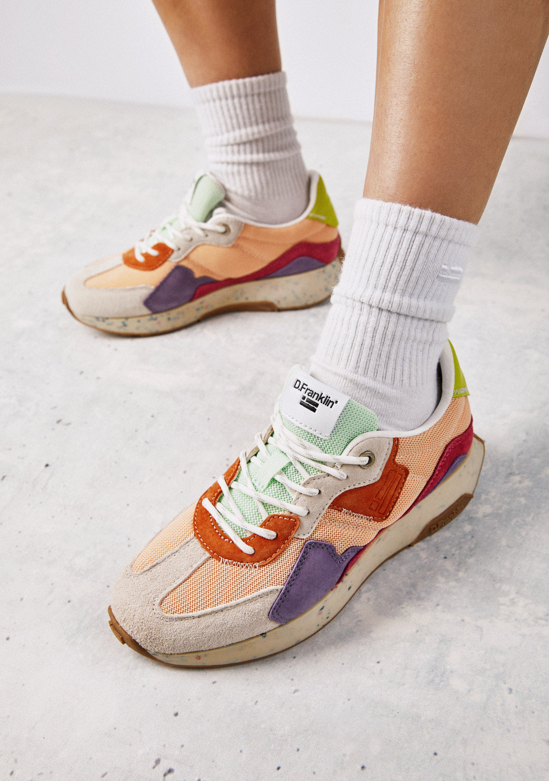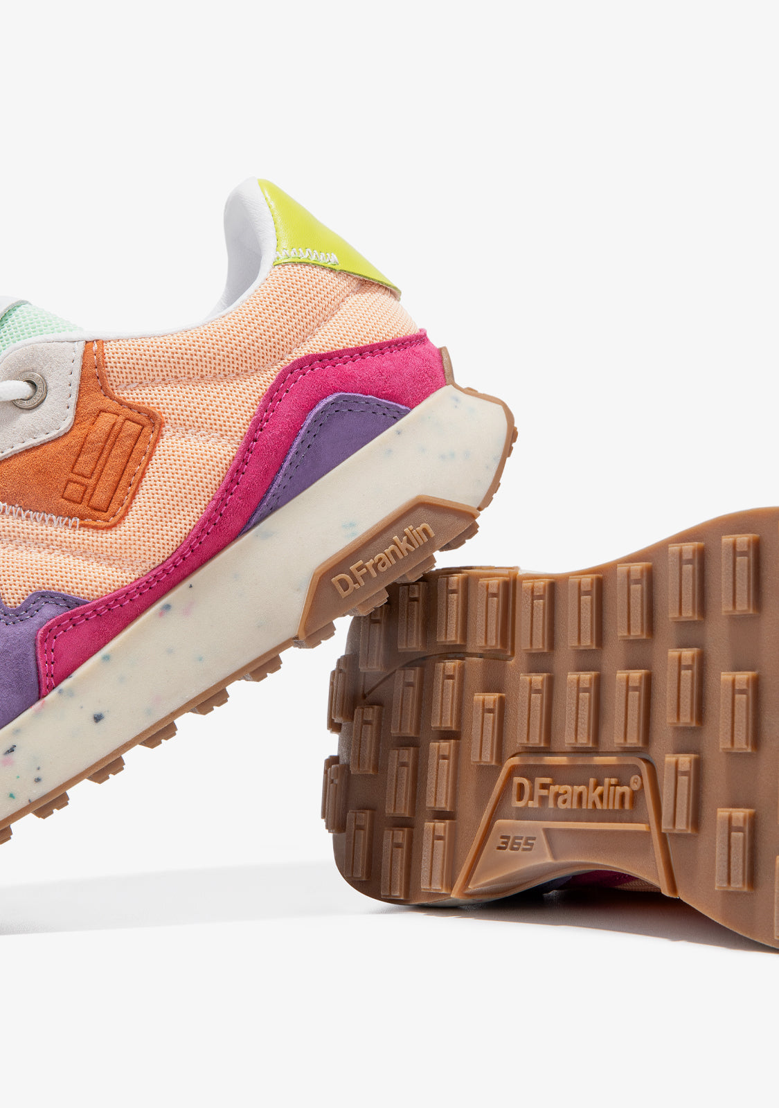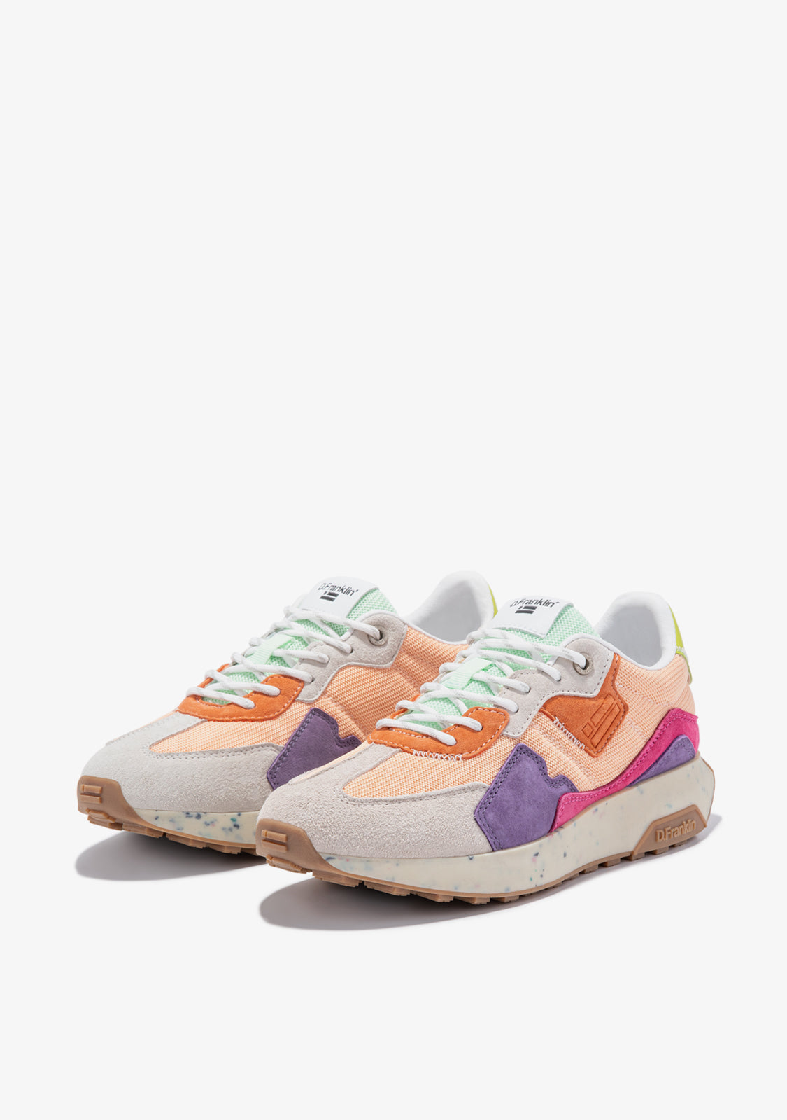 Questo modello combina tonalità arancioni, verdi e viola in un design che si distingue per la sua unicità. Presenta una bandiera D.Franklin sul lato e dettagli con lacci per una vestibilità perfetta. Inoltre, ha una suola a due densità. La prima è realizzata con materiali riciclati per un passo comodo e leggero, e la seconda è goffrata per fornire aderenza.
