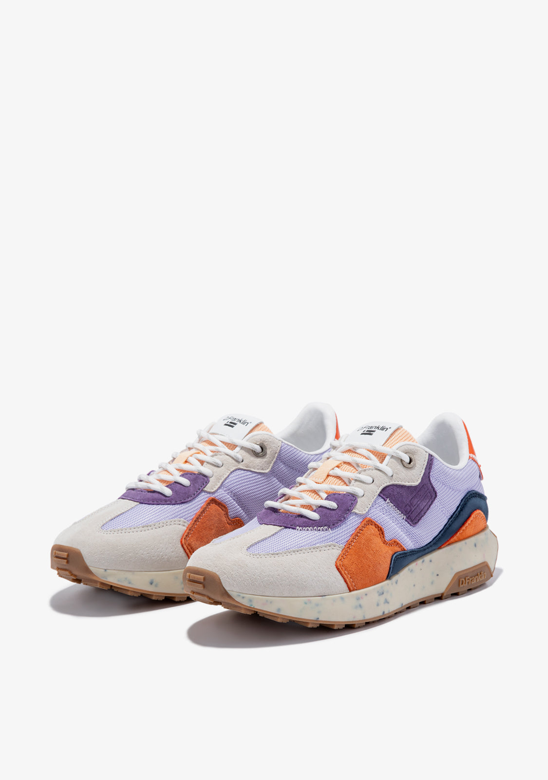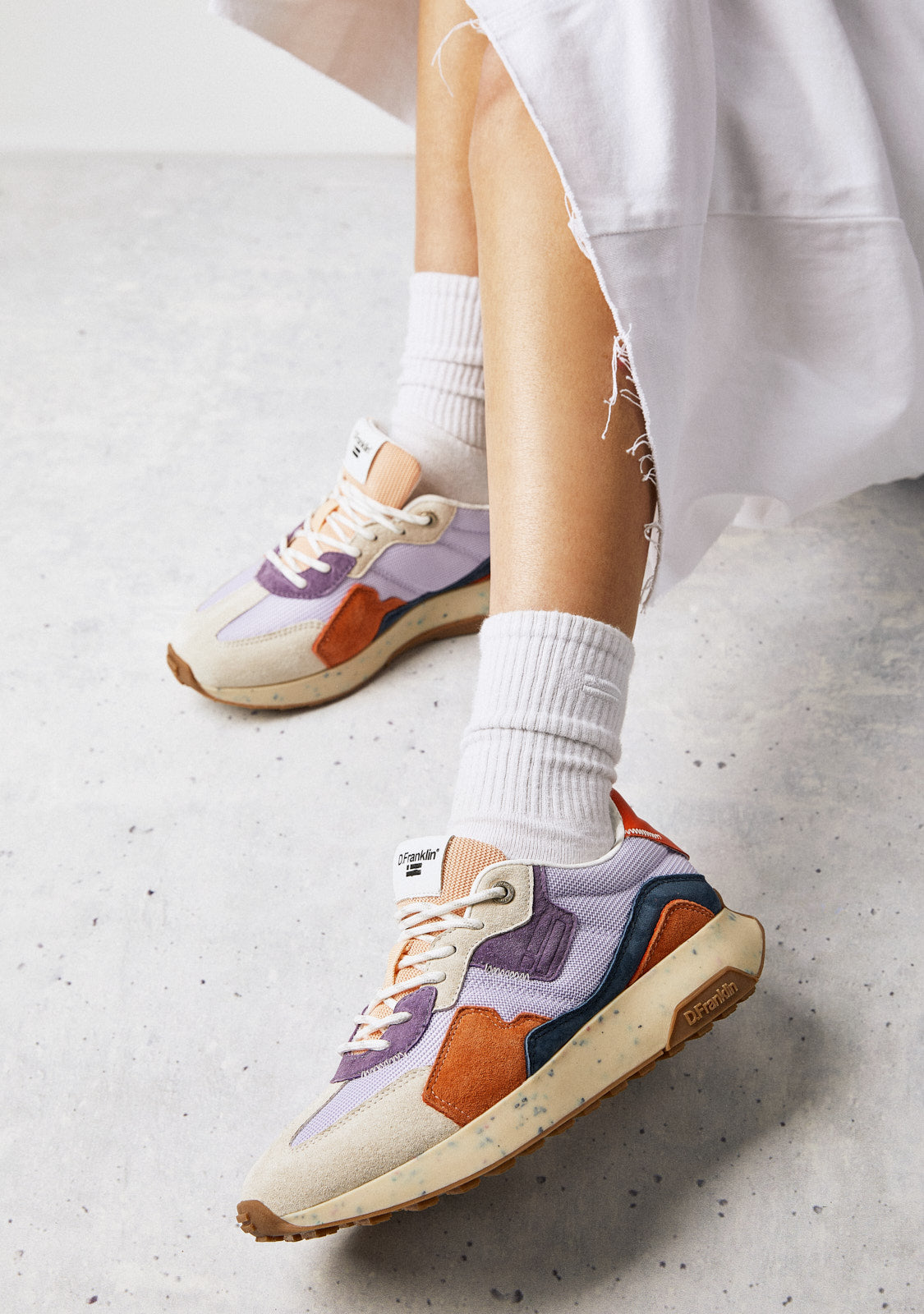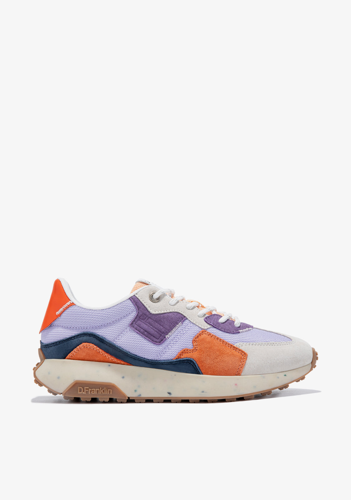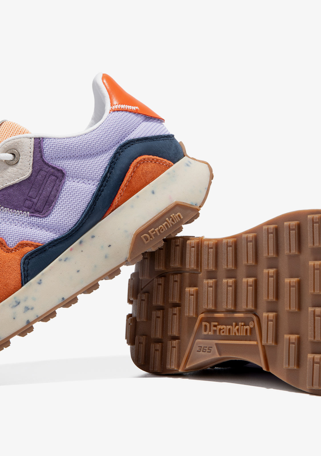 Questo modello combina toni arancioni, grigi e malva in un design che si distingue per la sua unicità. Presenta una bandiera D.Franklin sul lato e dettagli con lacci per una vestibilità perfetta. Inoltre, ha una suola a due densità. La prima è realizzata con materiali riciclati per un passo comodo e leggero, e la seconda è in rilievo per fornire aderenza.