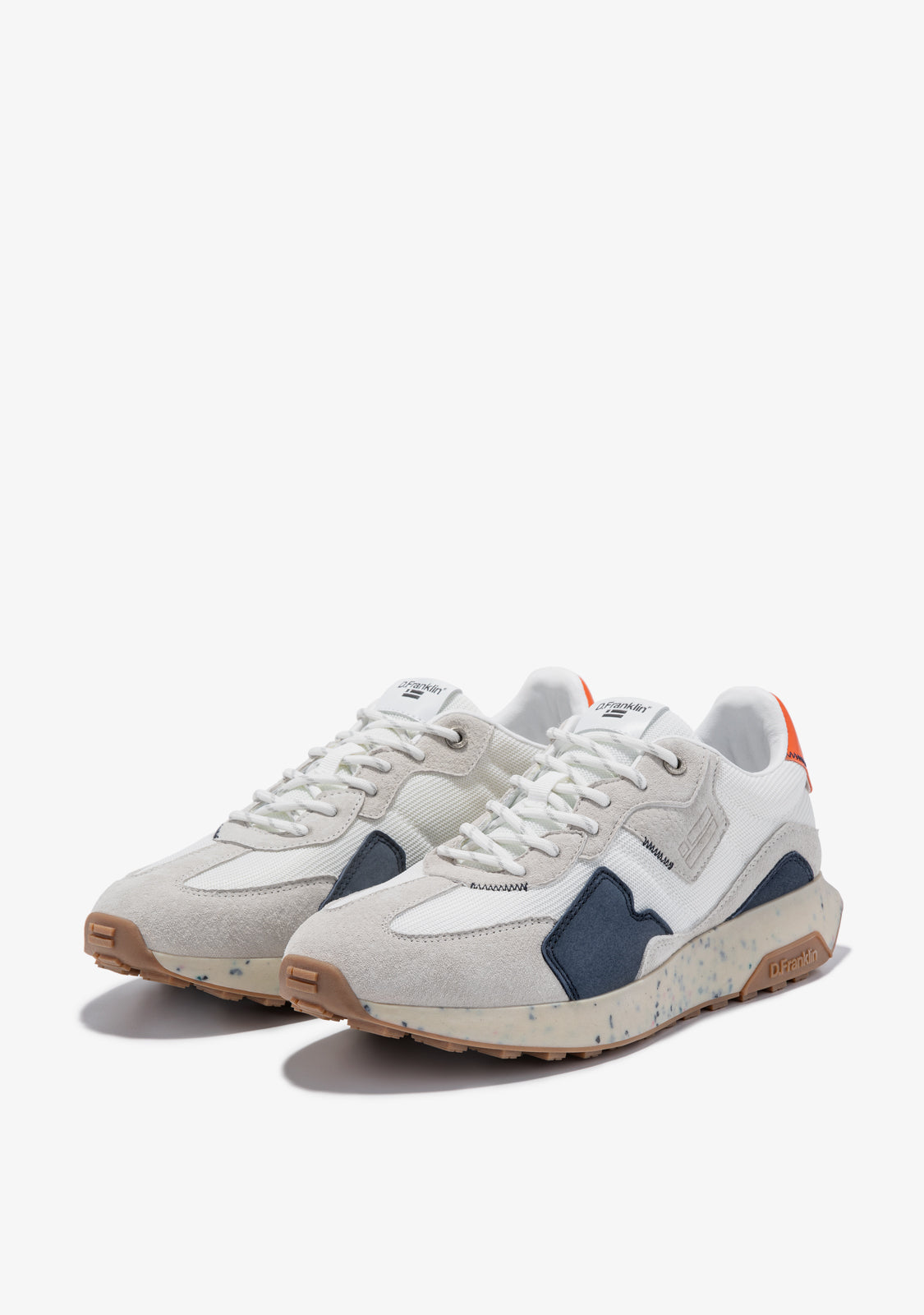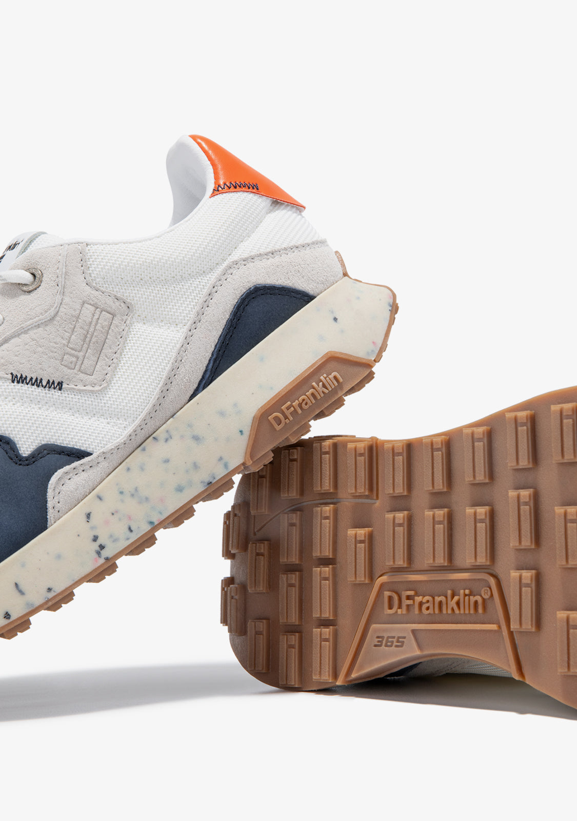 Questo modello combina tonalità arancioni, bianche e blu in un design che si distingue per la sua unicità. Presenta una bandiera D.Franklin sul lato e dettagli con lacci per una vestibilità perfetta. Inoltre, ha una suola a due densità. La prima è realizzata in materiali riciclati per una camminata confortevole e leggera, e la seconda è goffrata per fornire aderenza.