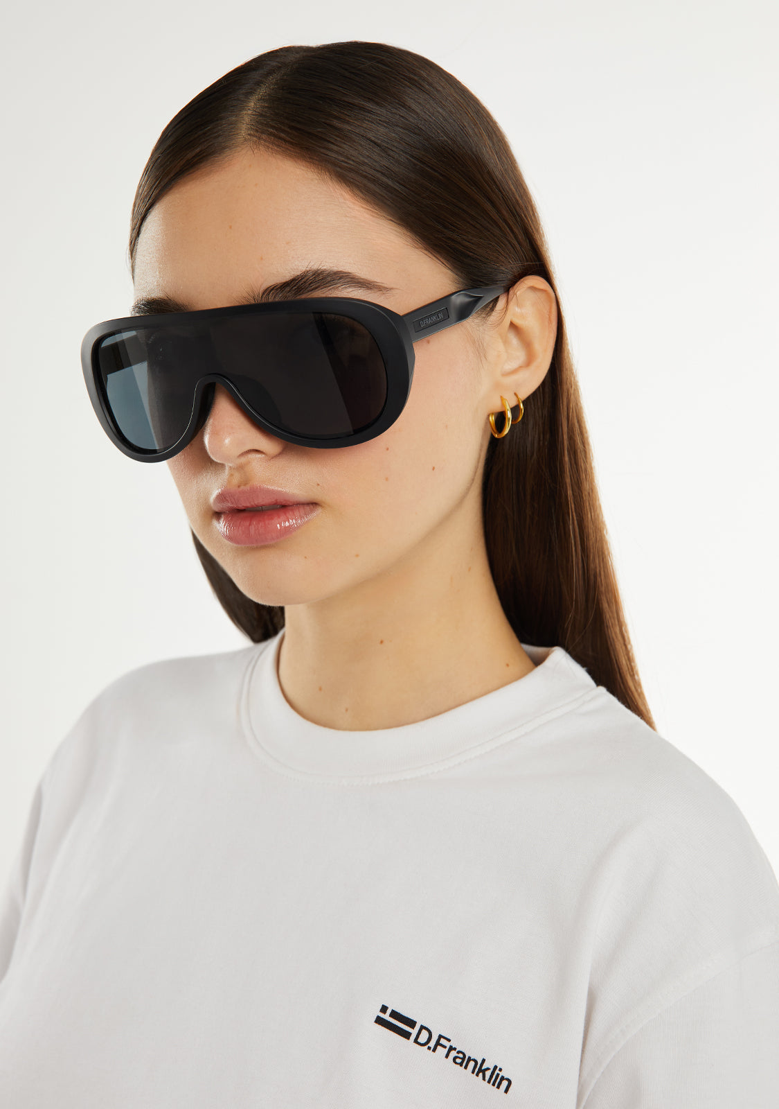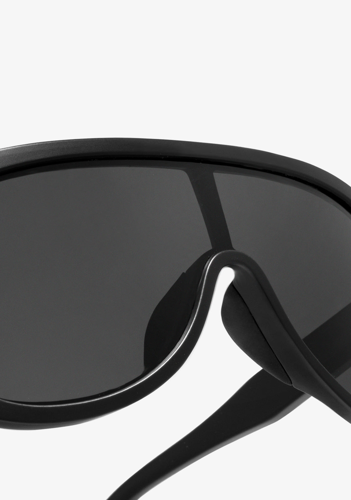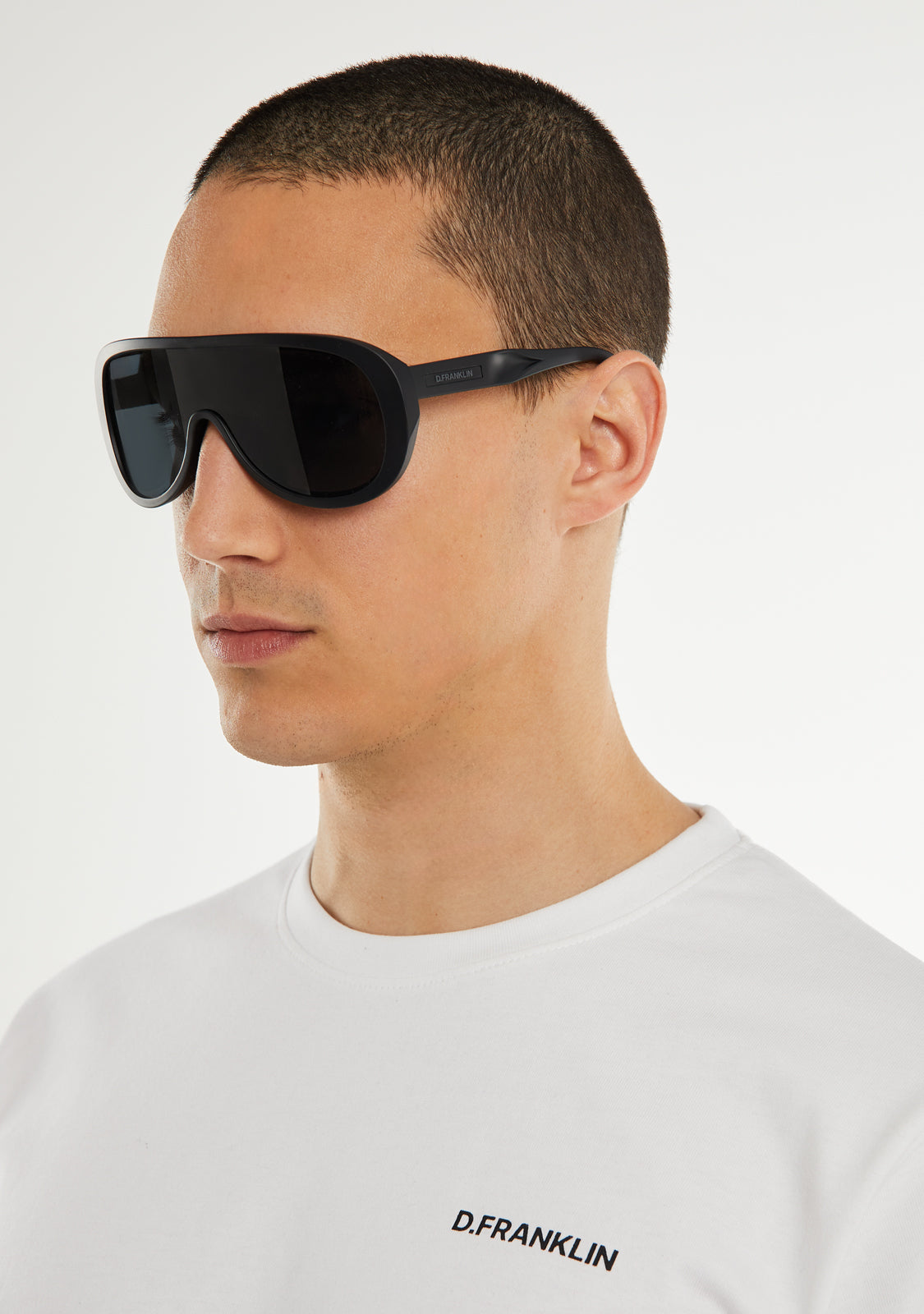 Questo modello presenta una montatura nera opaca con un'estetica leggermente curvata. Ha lenti fumé e il nostro emblema distintivo sul lato delle tempie. La larghezza uniforme delle lenti di 131 mm e il frontale di 147 mm sono uniti da una tempia di 135 mm.