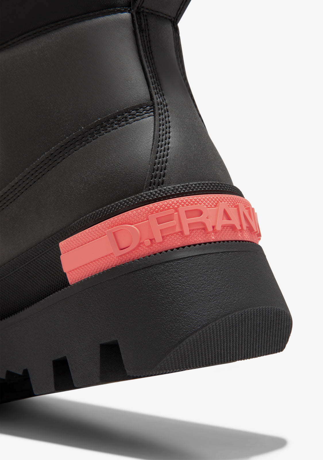 Questo modello D.Franklin in nero presenta lacci in stile trail. La sua suola in stile track offre un grip senza pari. Presenta anche il nostro logo e stemma impressi sulla zeppa e sulla punta.