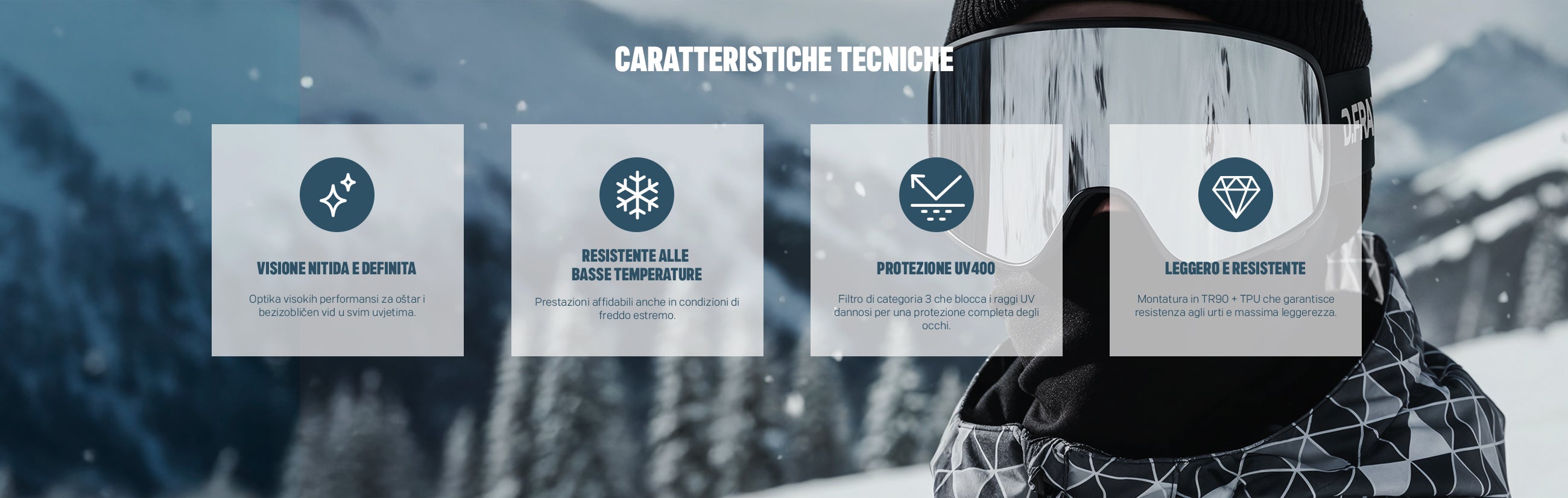 Occhiali da neve Blizzard, la nostra tempesta invernale... Scivola giù per le piste con una nuova visione. Un accessorio progettato per la NEVE. In lettere maiuscole.