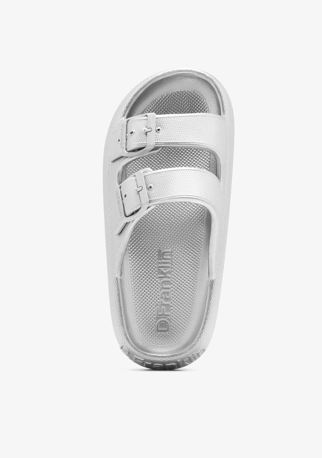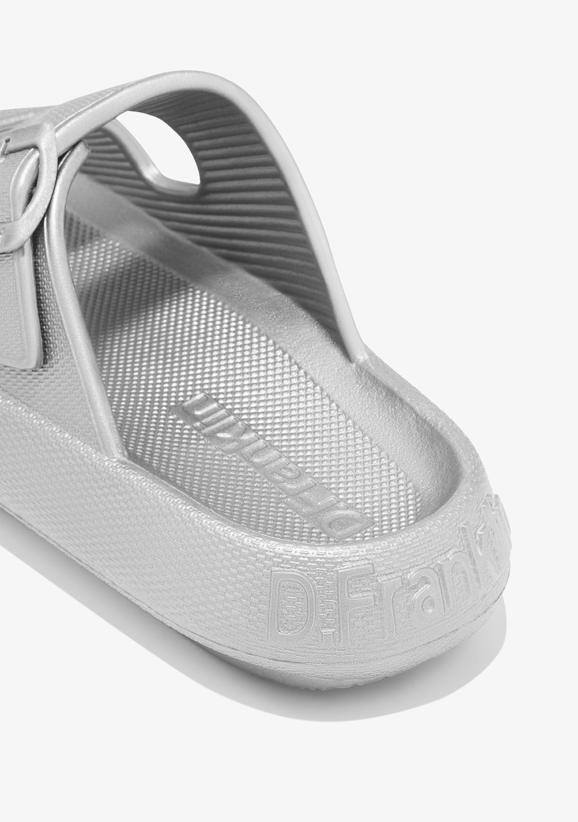 Eleva il tuo comfort e stile quest'estate con i sandali Bloomer Bio Silver di D.Franklin. Realizzati in EVA, questi sandali offrono un'eccezionale leggerezza e durata che supportano ogni tuo passo. La loro suola a doppia densità fornisce un'ottima ammortizzazione, garantendo comfort per tutto il giorno.
