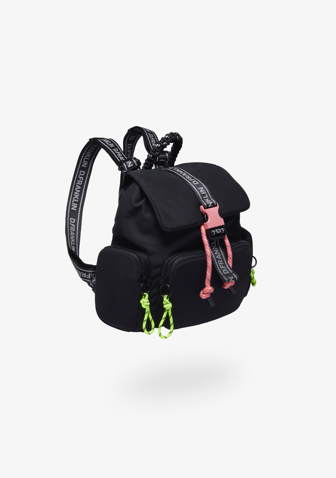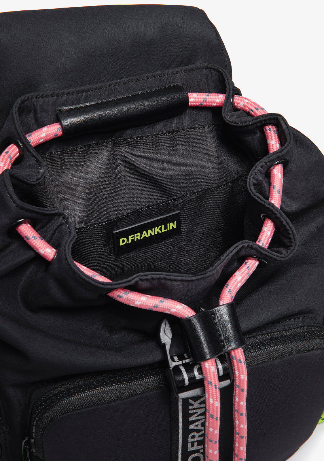 Questo design nero è realizzato in 100% poliestere, mentre il suo interno ha una fodera in cotone. Presenta piccoli dettagli a contrasto in tonalità lime e fucsia che gli conferiscono un tocco unico e distintivo. Ha anche una chiusura a scatto e spallacci regolabili.