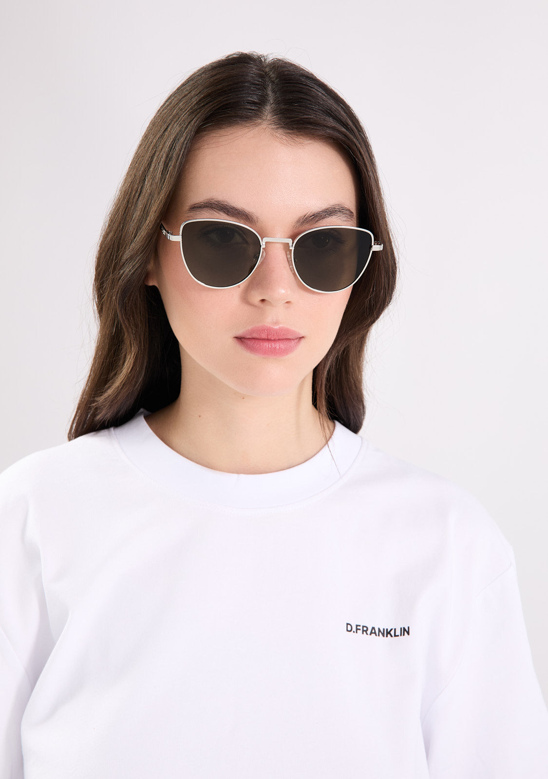 Il design Cat-Eye Legacy presenta una finitura metallica con un'estetica vintage. La sua montatura in tonalità argento è abbinata a lenti anti-riflesso di colore marrone scuro che consentono una visione sottile e definiscono i tratti del viso. La parte frontale misura 139 mm, e la larghezza della lente è di 53 mm. Le aste sono lunghe 140 mm e incorporano i nostri dettagli distintivi. Un pezzo retro ma minimalista per incorniciare qualsiasi outfit.