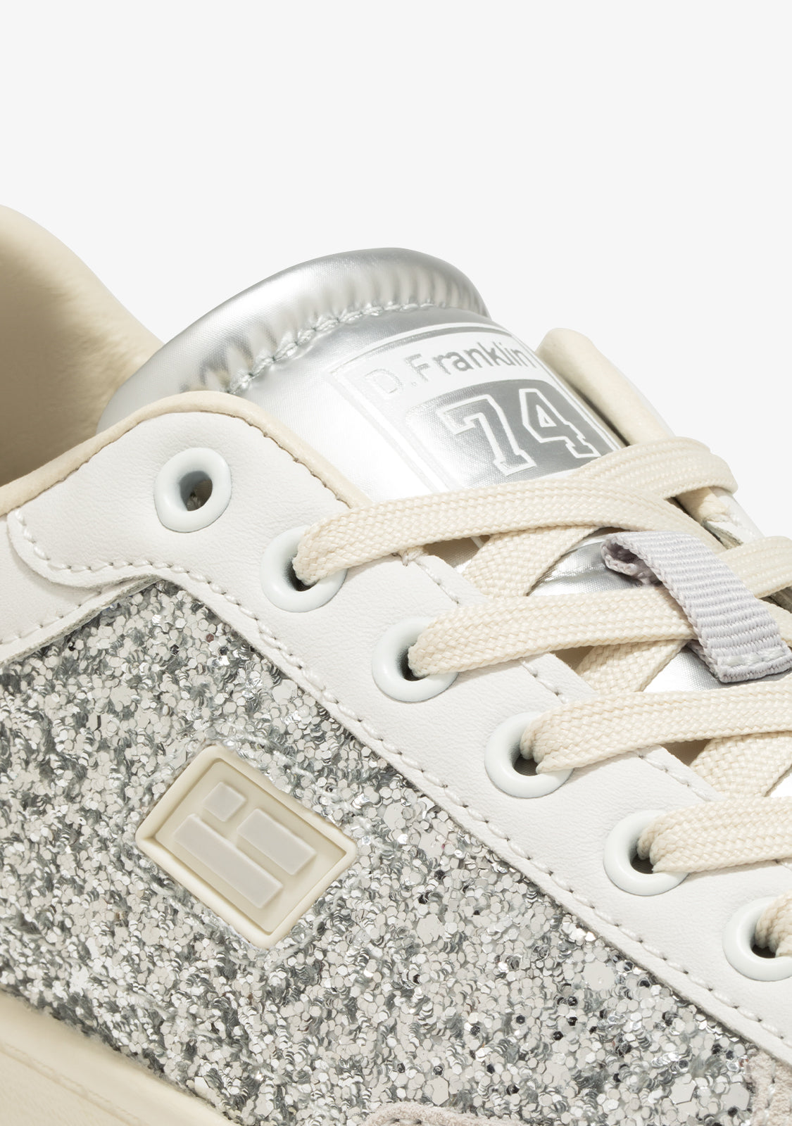 Brilla con stile in ogni passo del cammino con le scarpe Court Basic Glitter Silver di D.Franklin, progettate per chi vuole distinguersi. Questo modello presenta una finitura argento con accenti glitter, aggiungendo un tocco audace e sofisticato ai tuoi outfit.