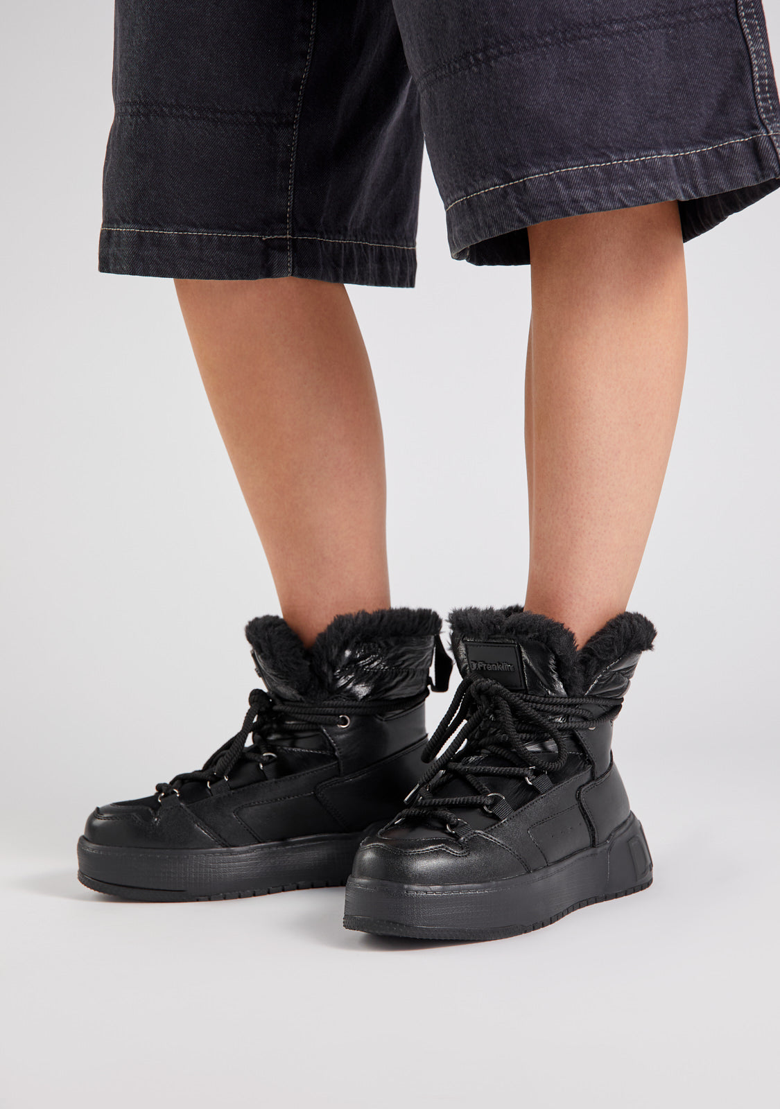 I nostri stivali con pelliccia interna presentano una finitura trapuntata. Questo modello completamente nero presenta lacci multi-posizione abbinati per grip e ammortizzazione.