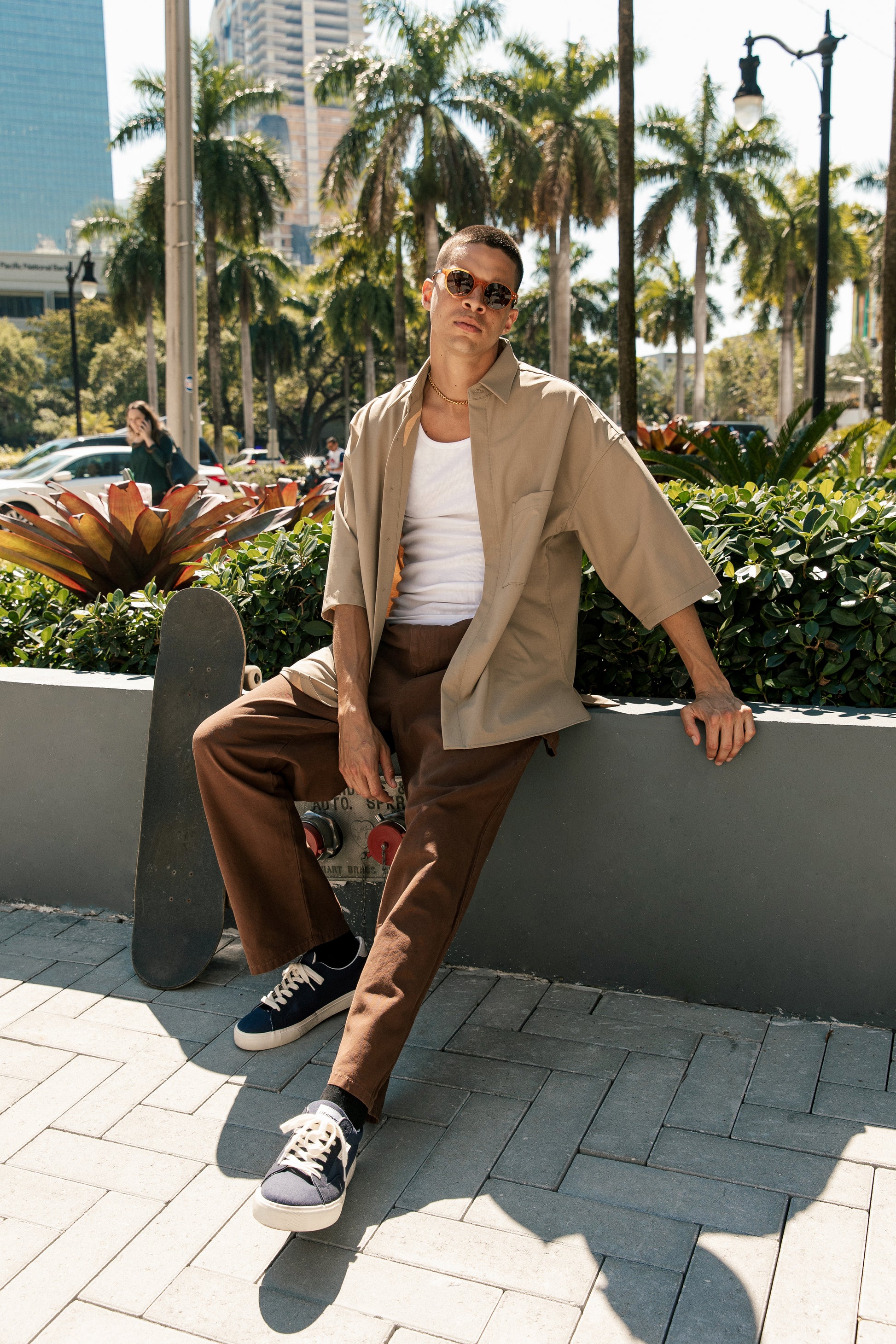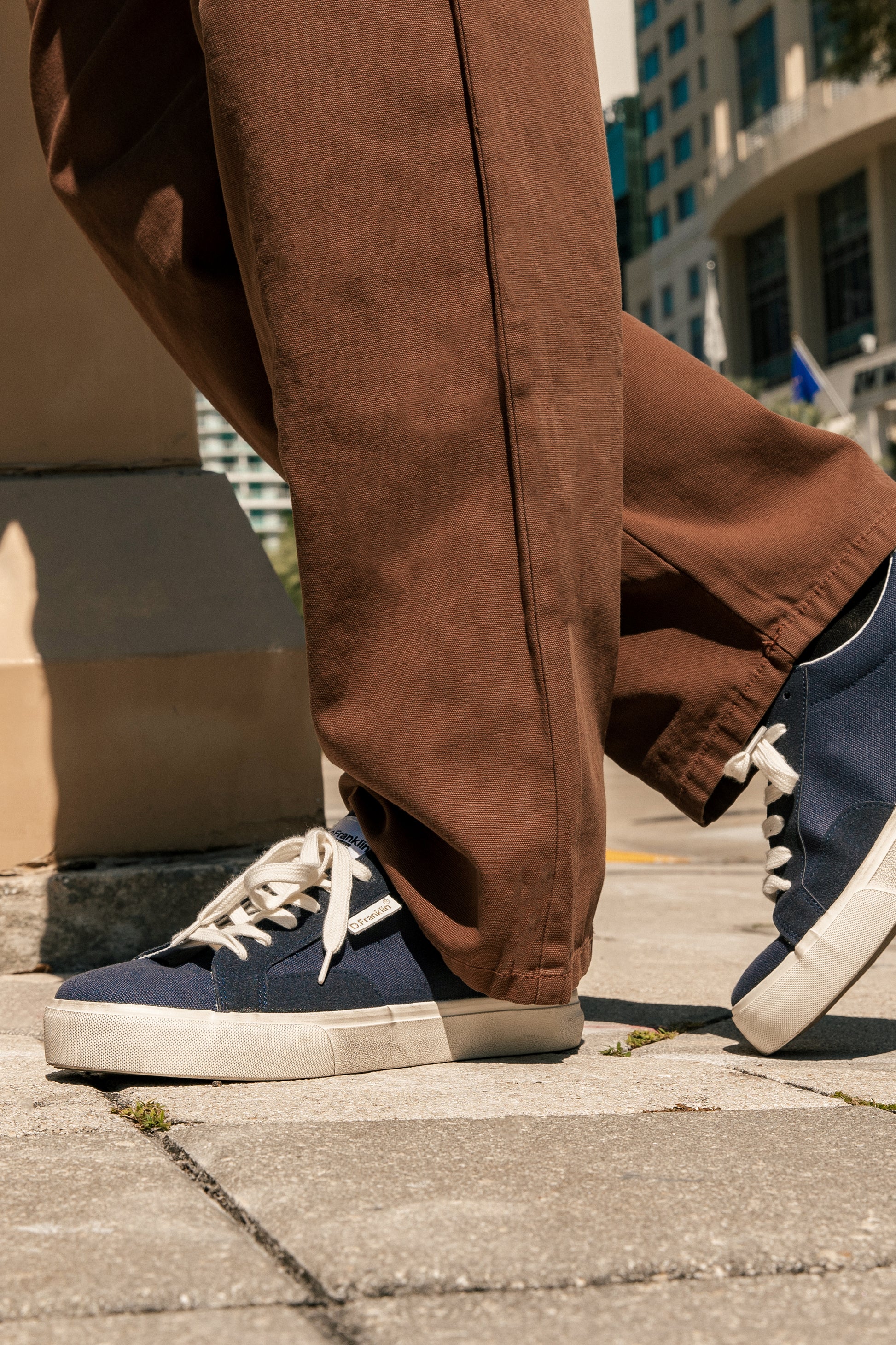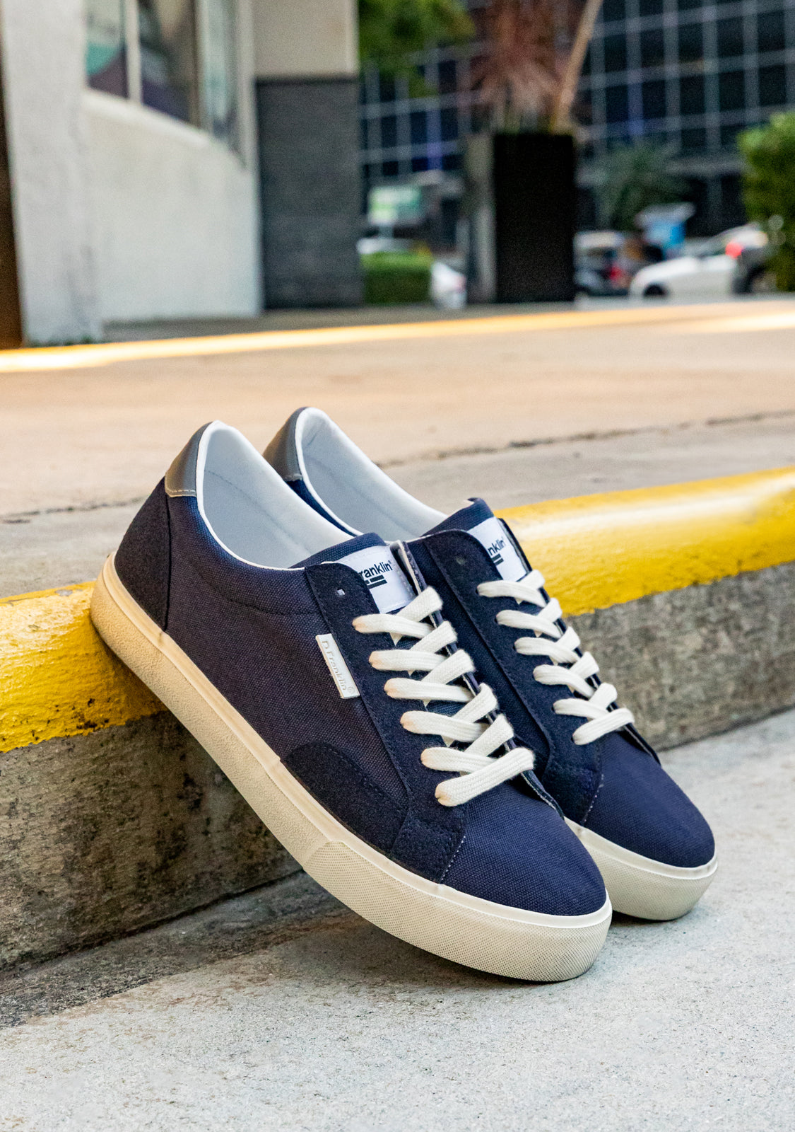 Sneaker a taglio basso ispirata alla scena del pattinaggio a Venezia Beach, Los Angeles. Realizzata in tessuto riciclato di colore blu navy. Logo in rilievo sul tallone su sfondo grigio. Lacci in cotone.