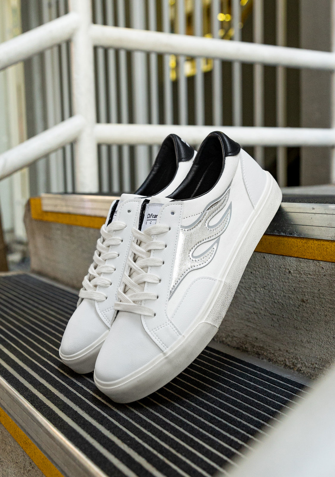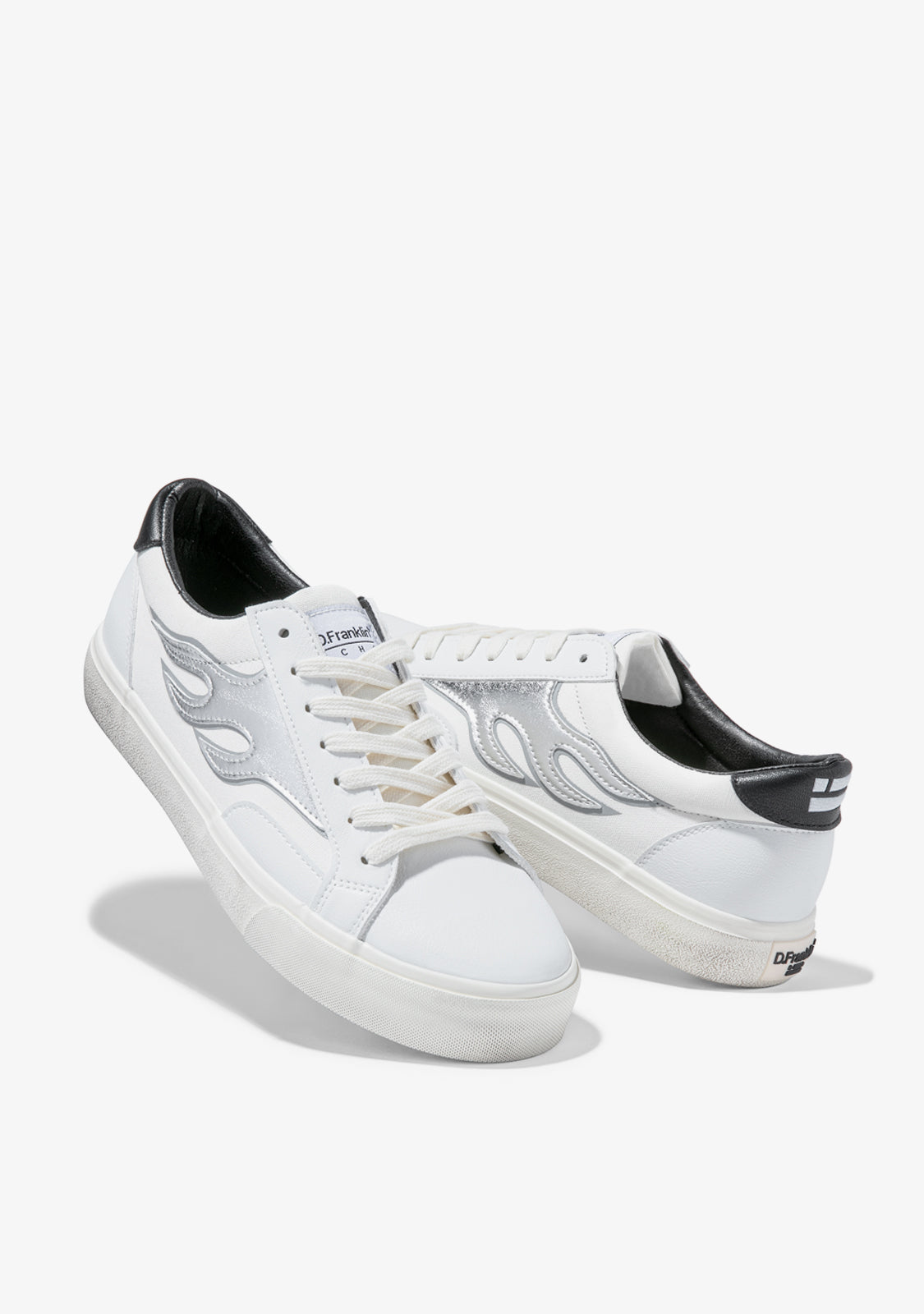 Sneaker a taglio basso ispirata alla scena dello skate a Venice Beach, Los Angeles. Dettaglio fiamma sul lato in texture metallica argento su tessuto riciclato bianco. Logo impresso sul tallone su sfondo rosso. Lacci in cotone.