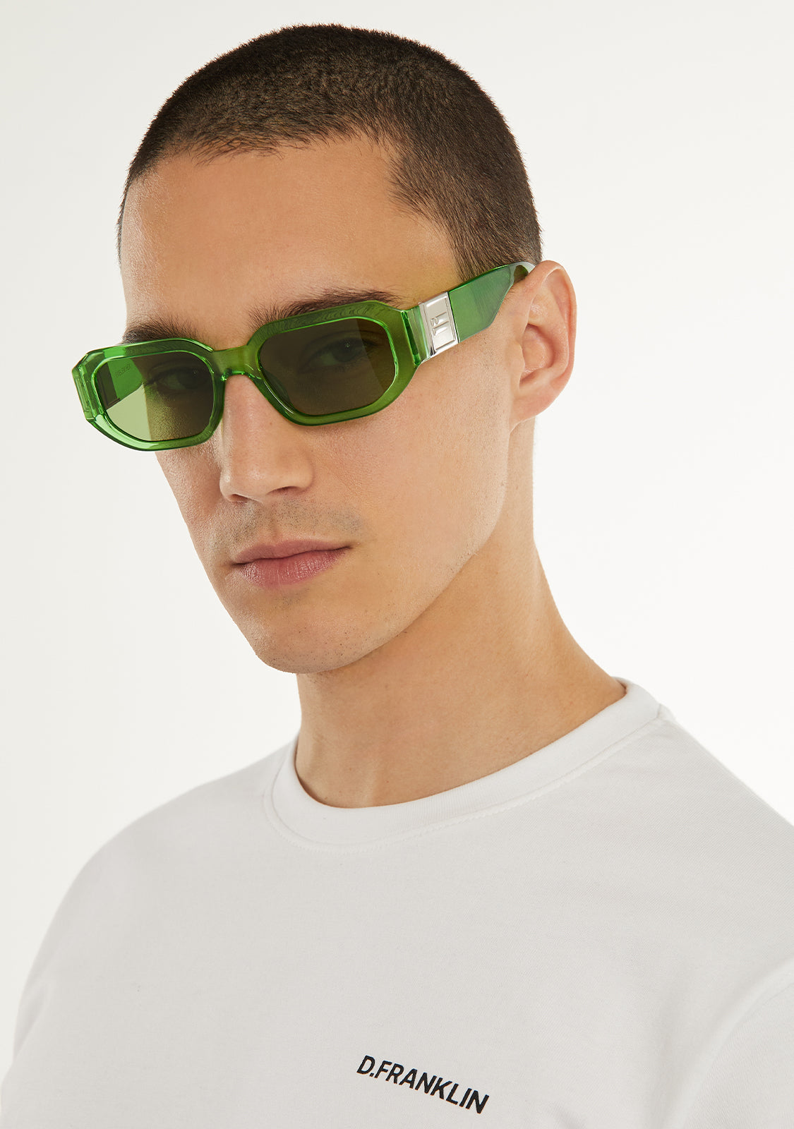 Lenti polarizzate verdi e montatura abbinata evidenziano l'unicità di questo design. Presenta la nostra distintiva bandiera D.Franklin con una finitura oro metallico su entrambe le tempie. La larghezza delle lenti di 52 mm e il frontale di 139 mm sono uniti da una tempia asimmetrica di 140 mm.