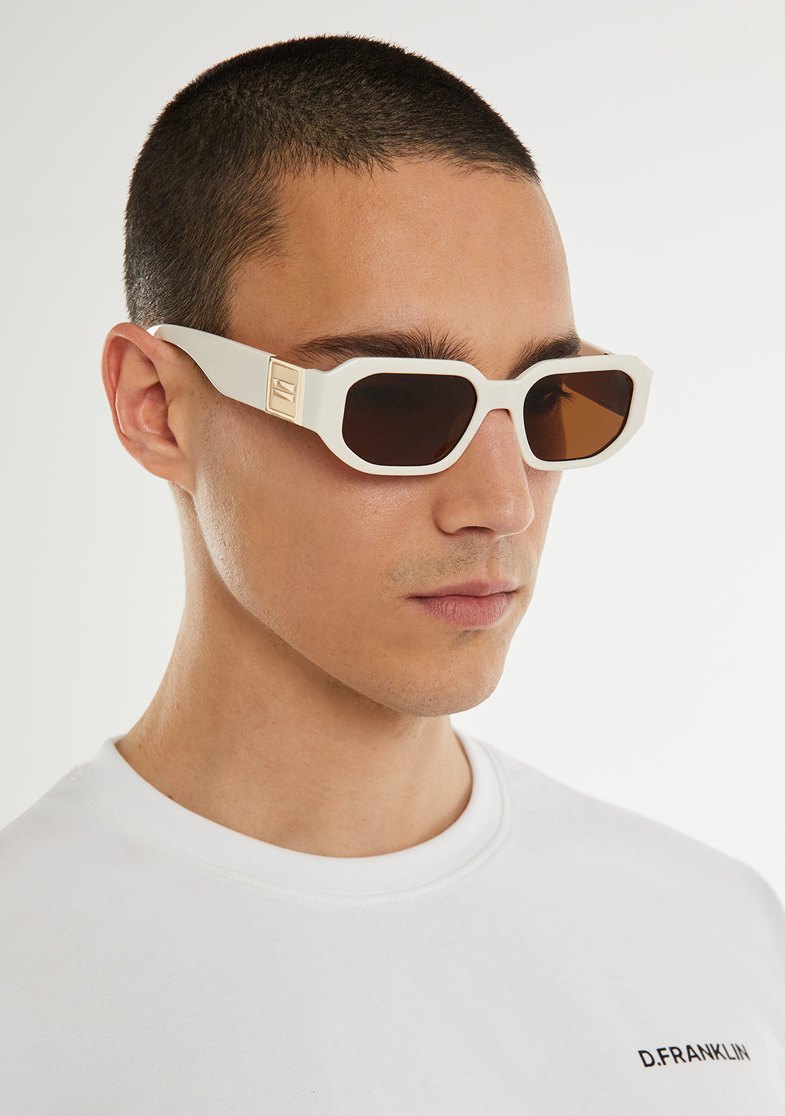 Lenti polarizzate marroni e montature bianche evidenziano l'unicità di questo design. Presenta la nostra distintiva bandiera D.Franklin con una finitura oro metallico su entrambe le tempie. La larghezza delle lenti di 52 mm e il frontale di 139 mm sono uniti da una tempia asimmetrica di 140 mm.