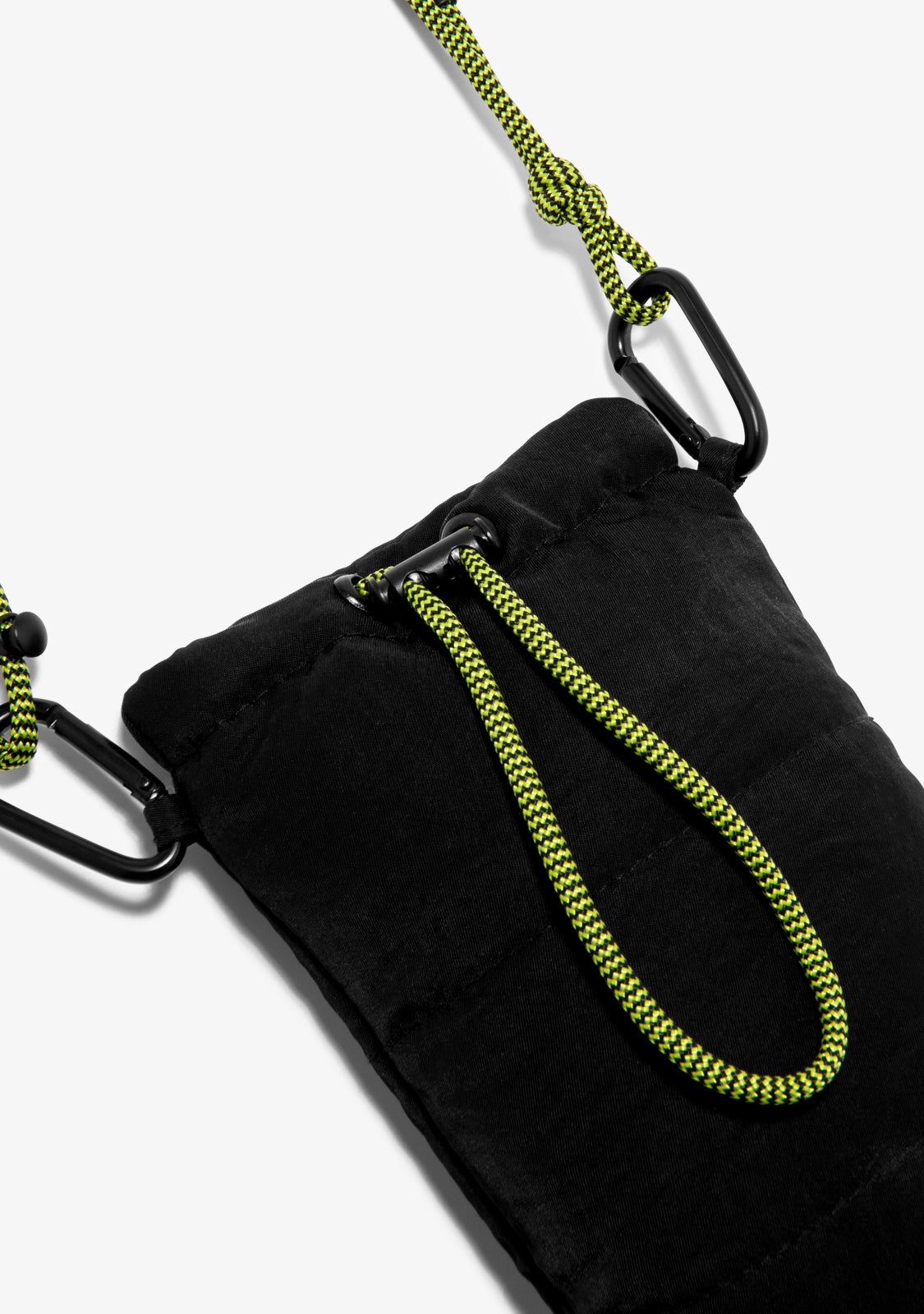 Questo modello con finitura nera ha un cordino rimovibile di colore lime grazie ai suoi moschettoni che permettono di adattarne la lunghezza. Ha una chiusura regolabile e un logo D.Franklin di colore lime serigrafato sul davanti.