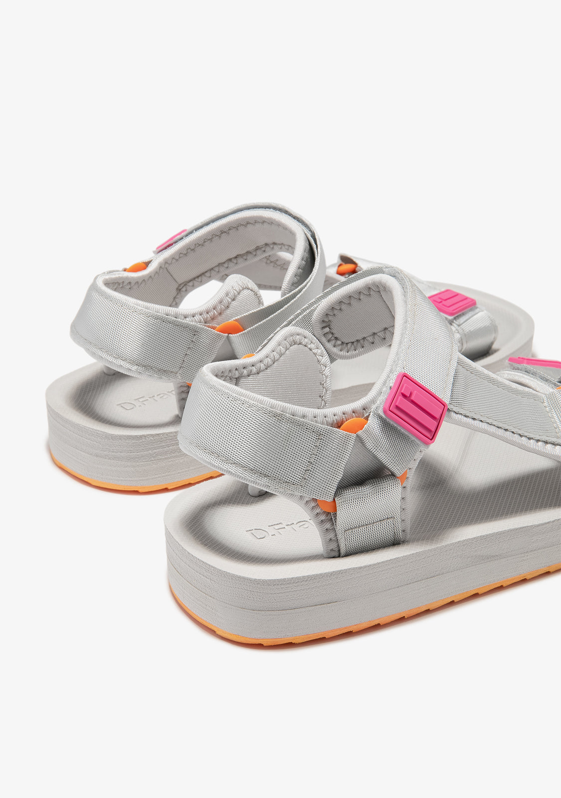 Ispirati ai giorni trascorsi all'aperto. Questo design presenta chiusure a fibbia triangolari e una chiusura a strappo. Caratterizzato da una nuova finitura argentata lucida. Con il simbolo D.Franklin sia sulla suola che sul lato.