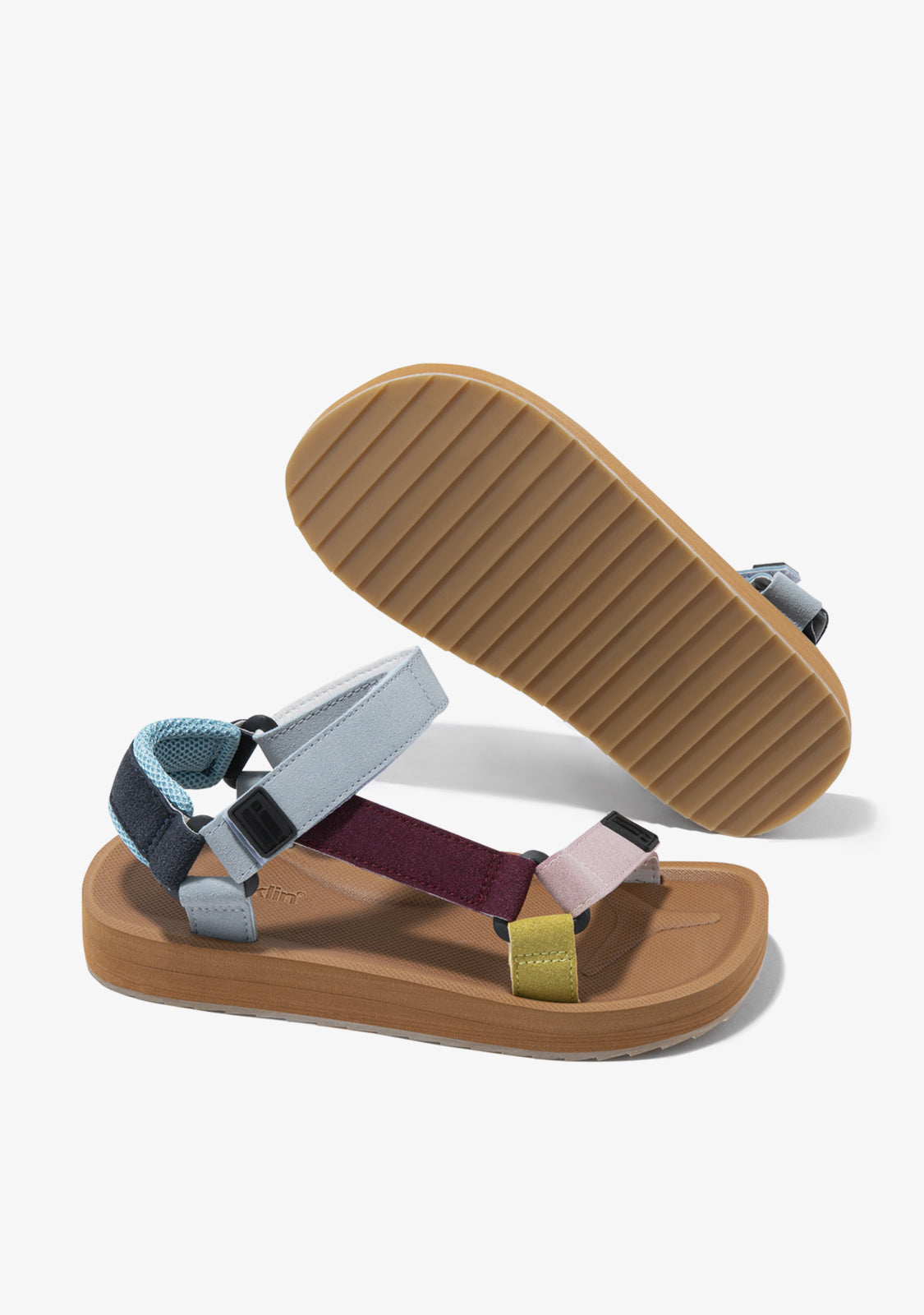 Una fuga dalla città. Una pausa dalla vita quotidiana. Un design con cui scoprire nuovi luoghi lontani dal familiare. Sandalo dallo stile sportivo con una combinazione di cinghie grigia, fucsia e gialla su una suola marrone. Costruito con suola in EVA per il comfort.