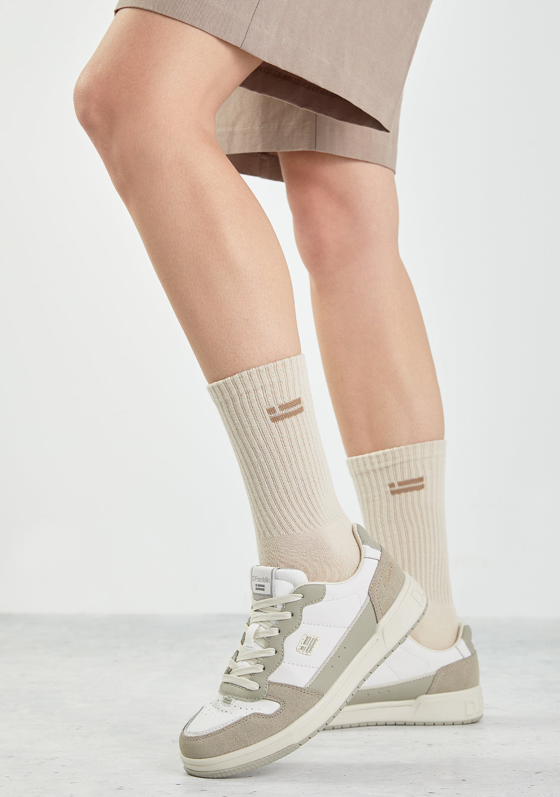 Realizzate con una miscela di materiali elastici e cotone. Questo design finito in beige presenta il nostro emblema abbinato sulla suola e una bandiera sul lato. La parte superiore ha un tessuto a coste che garantisce una vestibilità comoda e flessibile.