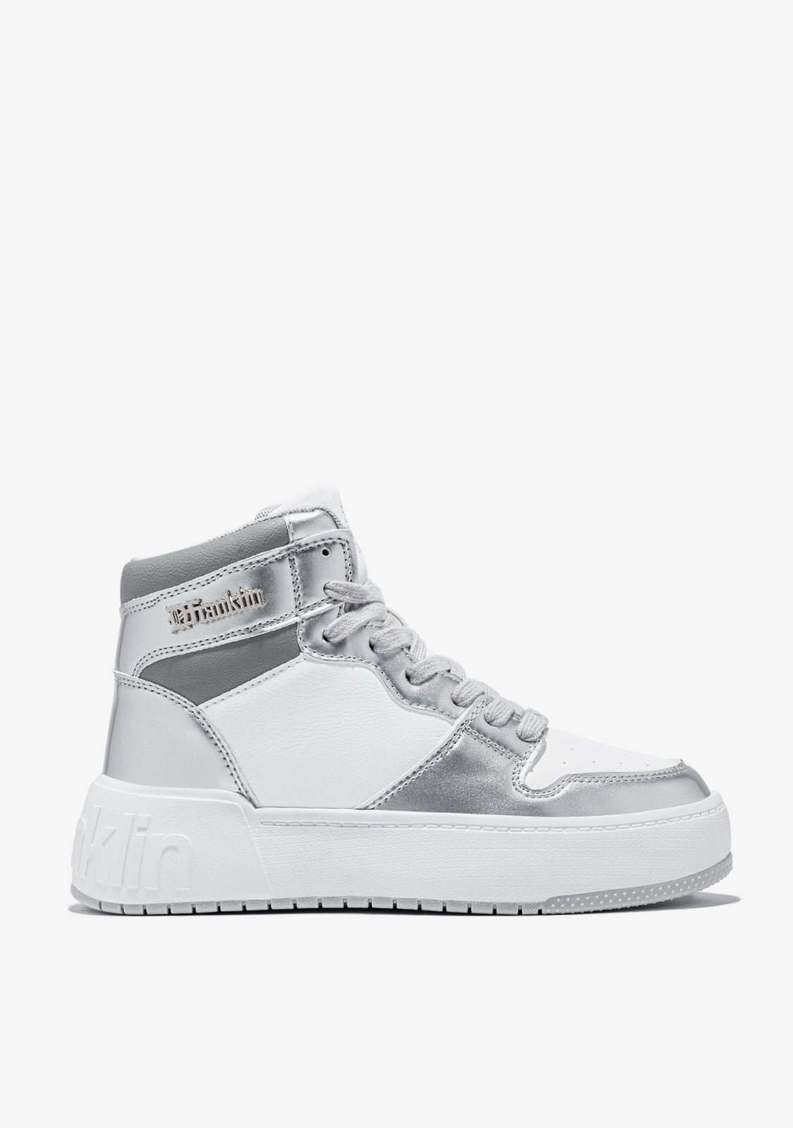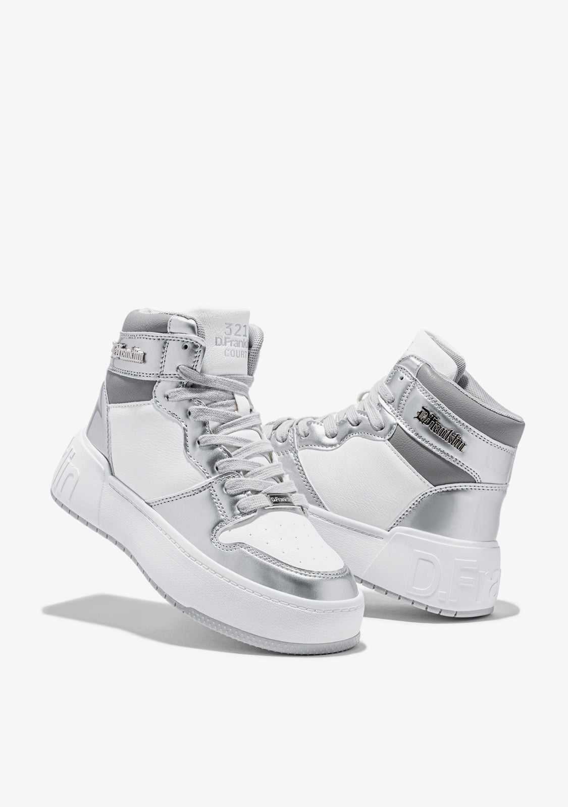 Presentiamo la Collezione Court di D.Franklin. Un nuovo modello ispirato allo sport, creato dal campo per offrire un design audace e versatile. Ora, con un design hi-top, il High Court White / Silver si caratterizza per una reinterpretazione della classica linea a strati, con una combinazione di bianco e argento.