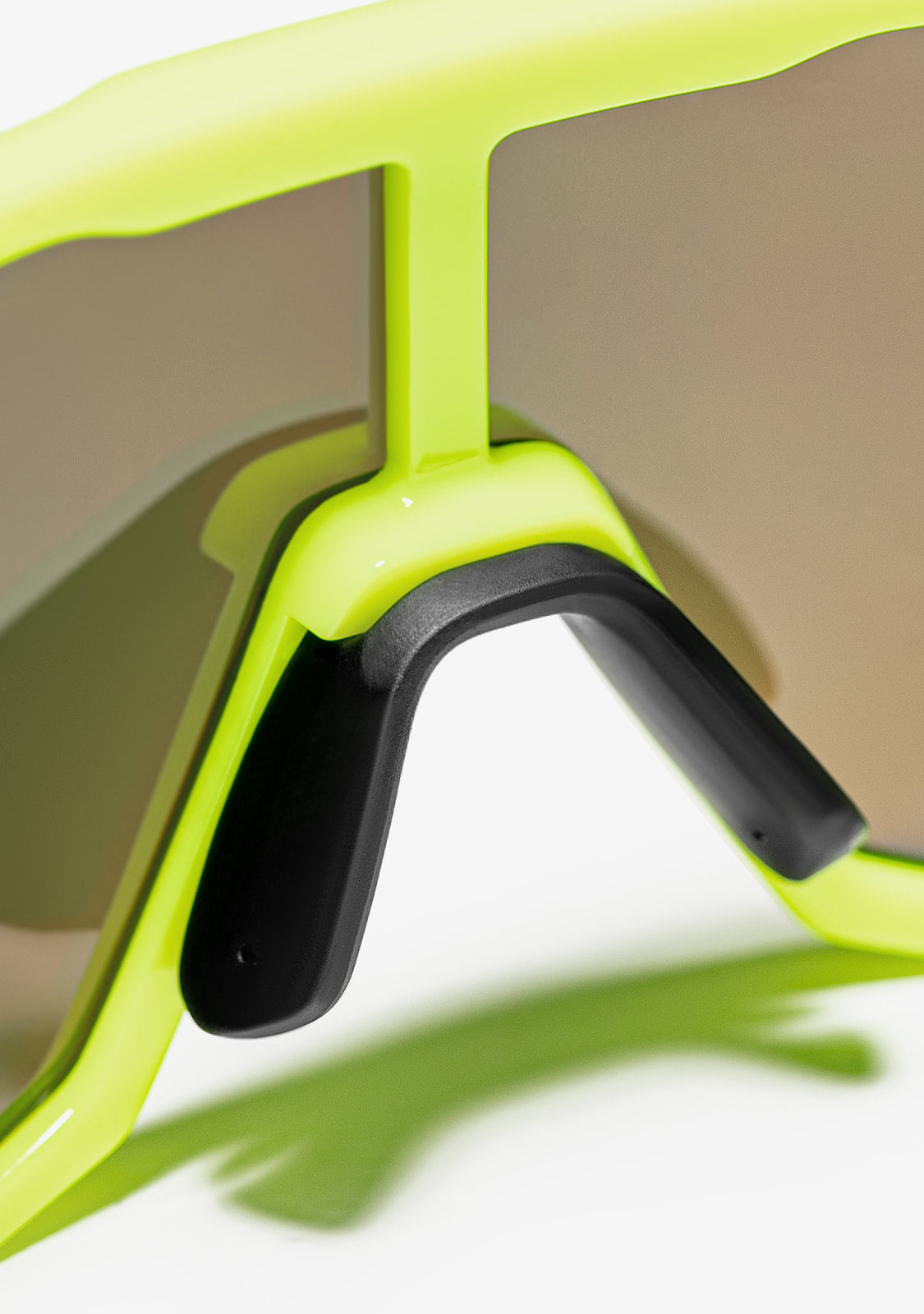 Gli Hurricane Lime / Red sono stati progettati per migliorare il movimento dell'aria e offrire una ventilazione ottimale. Questi occhiali hanno cuscinetti in silicone sul ponte del naso e sulle tempie, che garantiscono un'aderenza senza precedenti, aumentando il supporto nonostante il sudore.