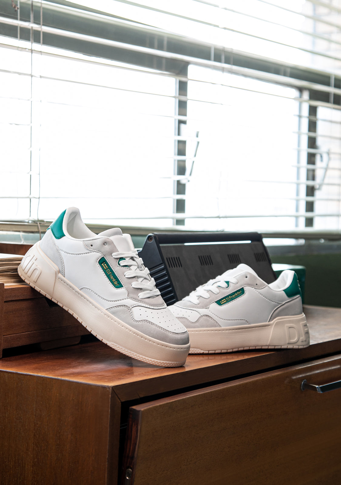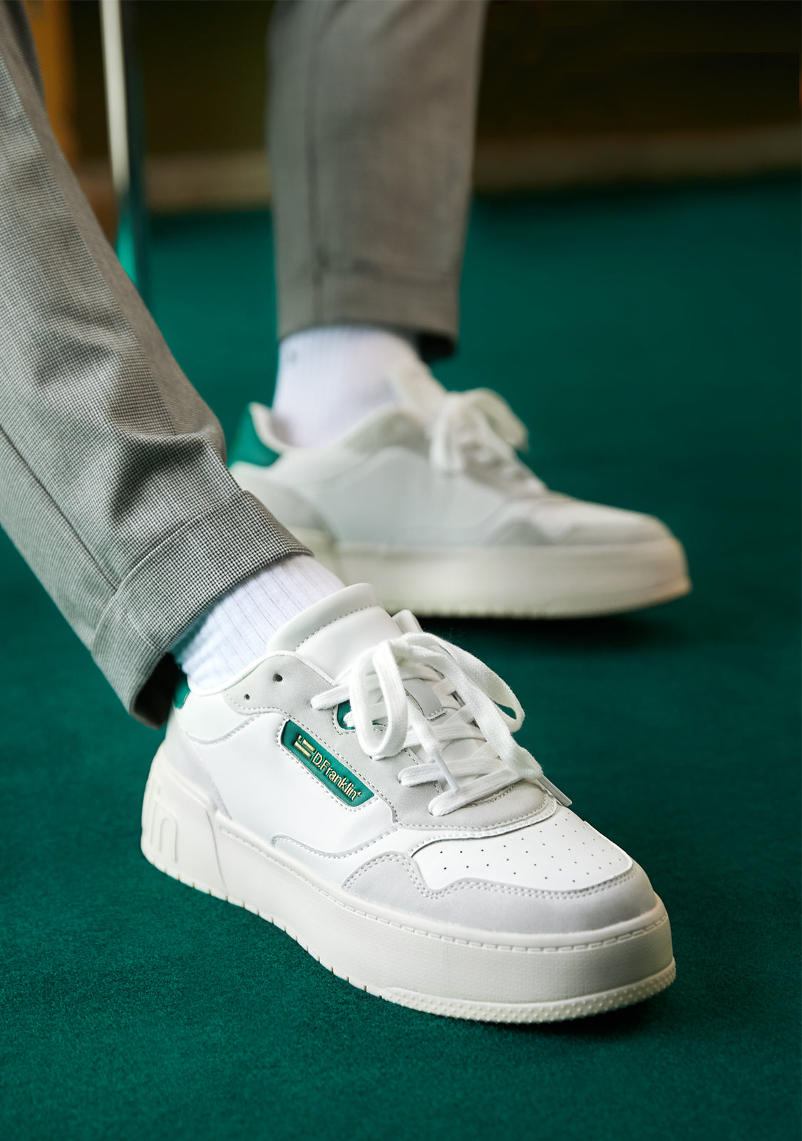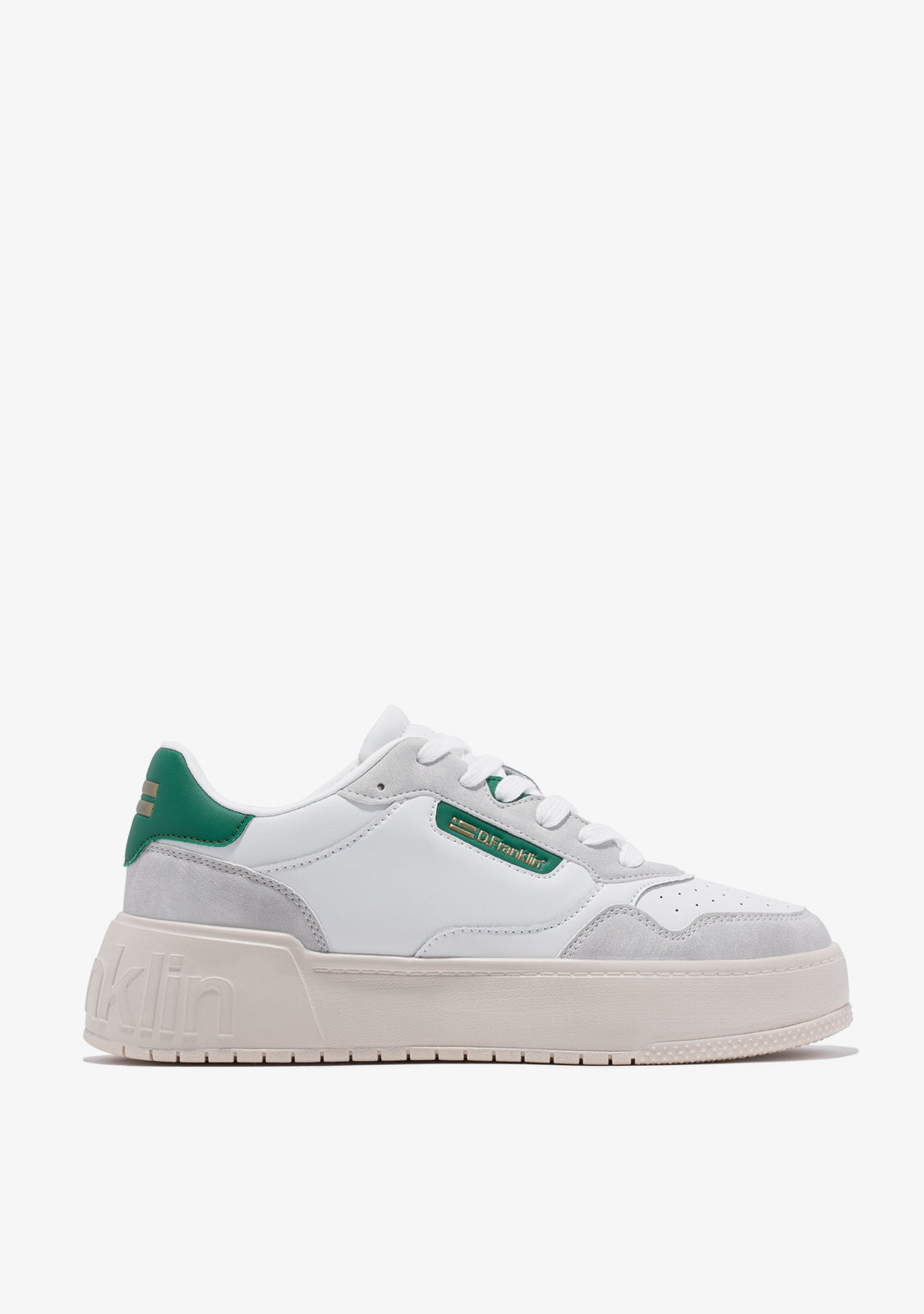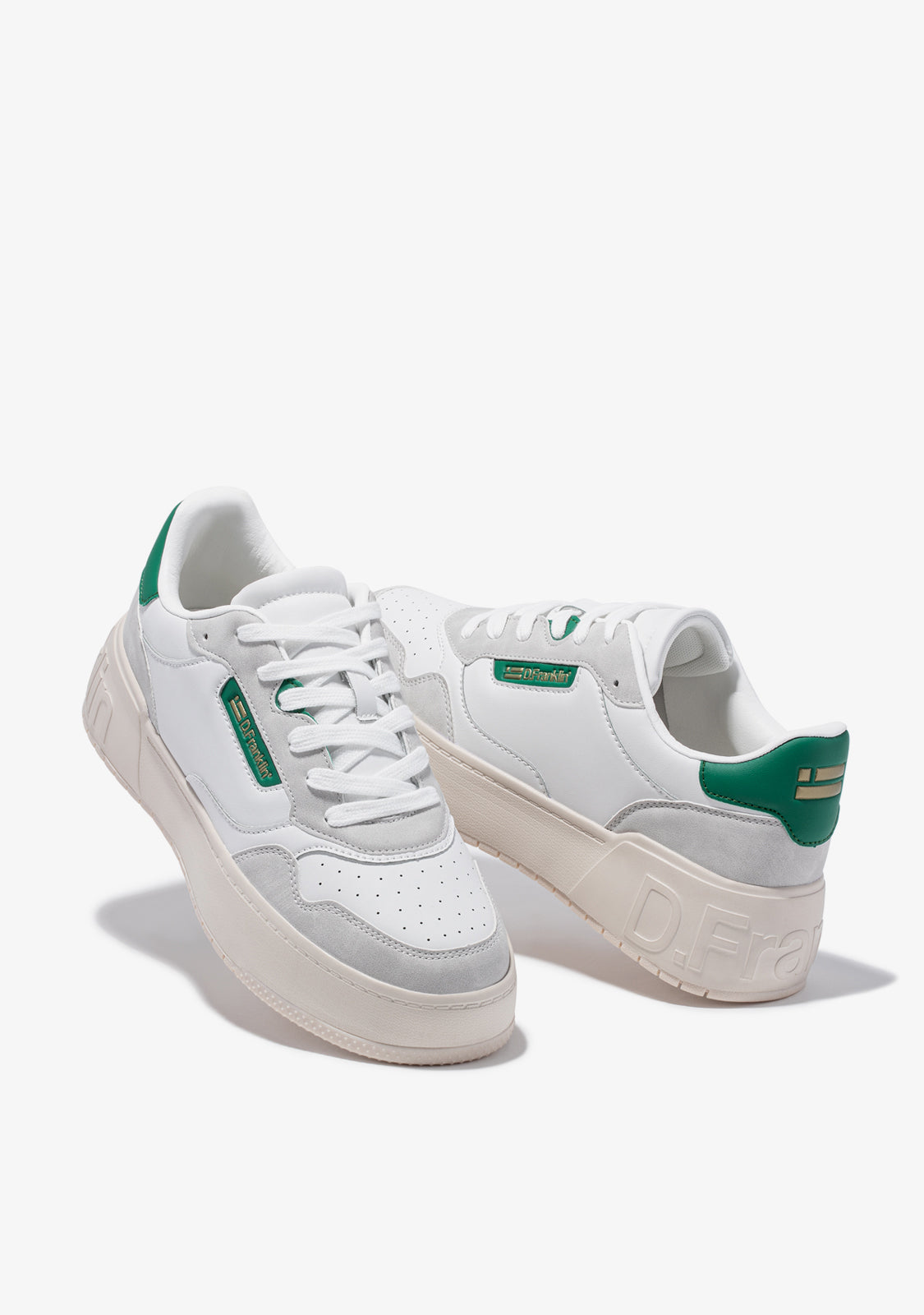 Un approccio raffinato ispirato dalla scena del basket degli 'anni '90. Allenatore minimalista con tacco ed emblema D.Franklin sul lato in tonalità oro su verde. Parti grigie a contrasto su pelle sintetica vegana bianca. Costruito con suola in gomma. Logo D.Franklin impresso sul tacco. Lacci in cotone. Suola di 4 cm.