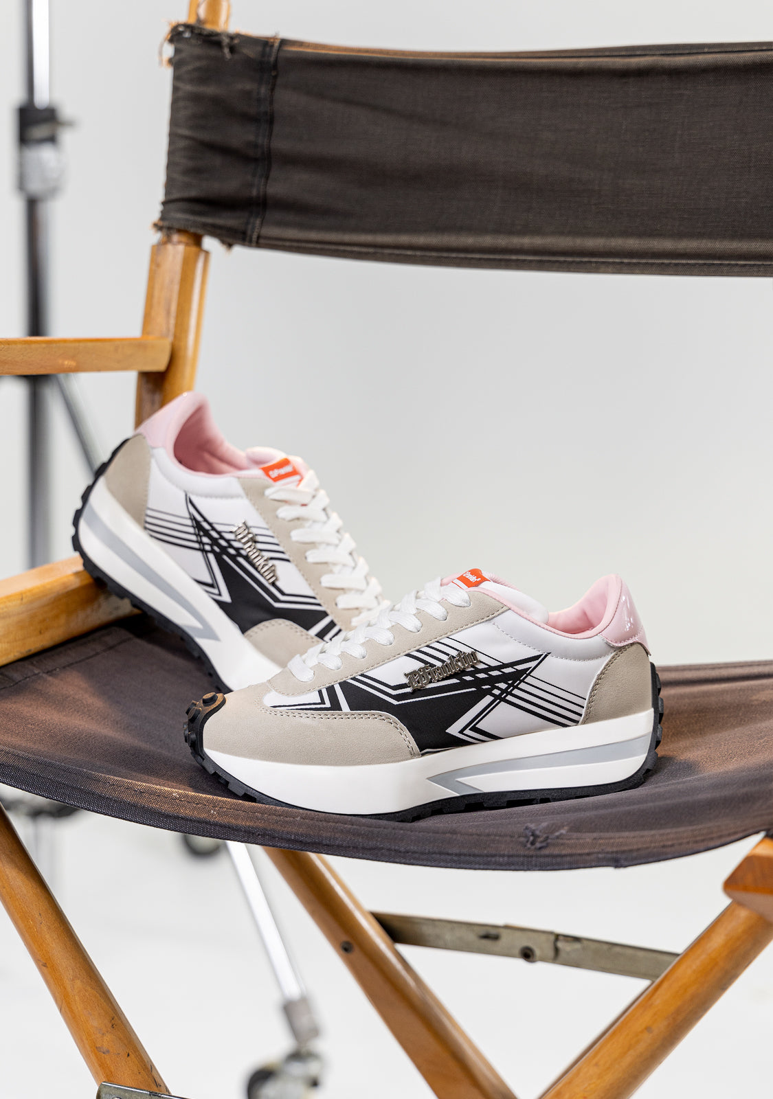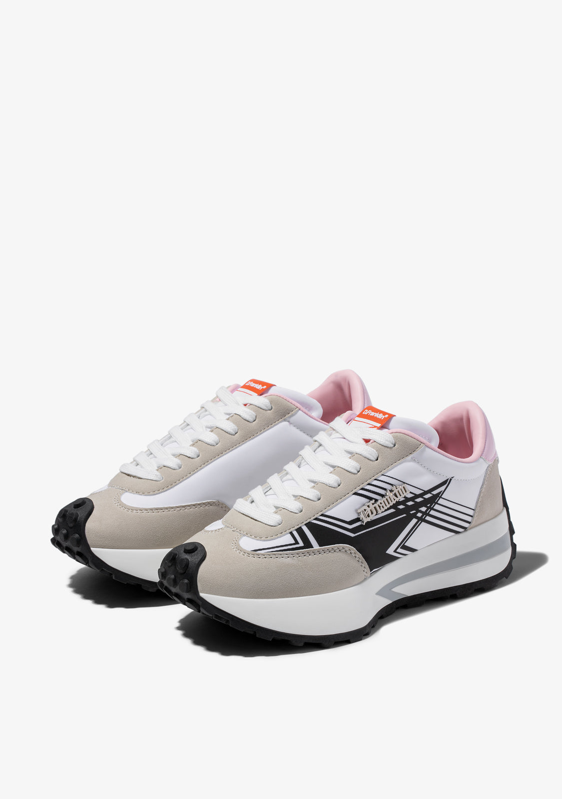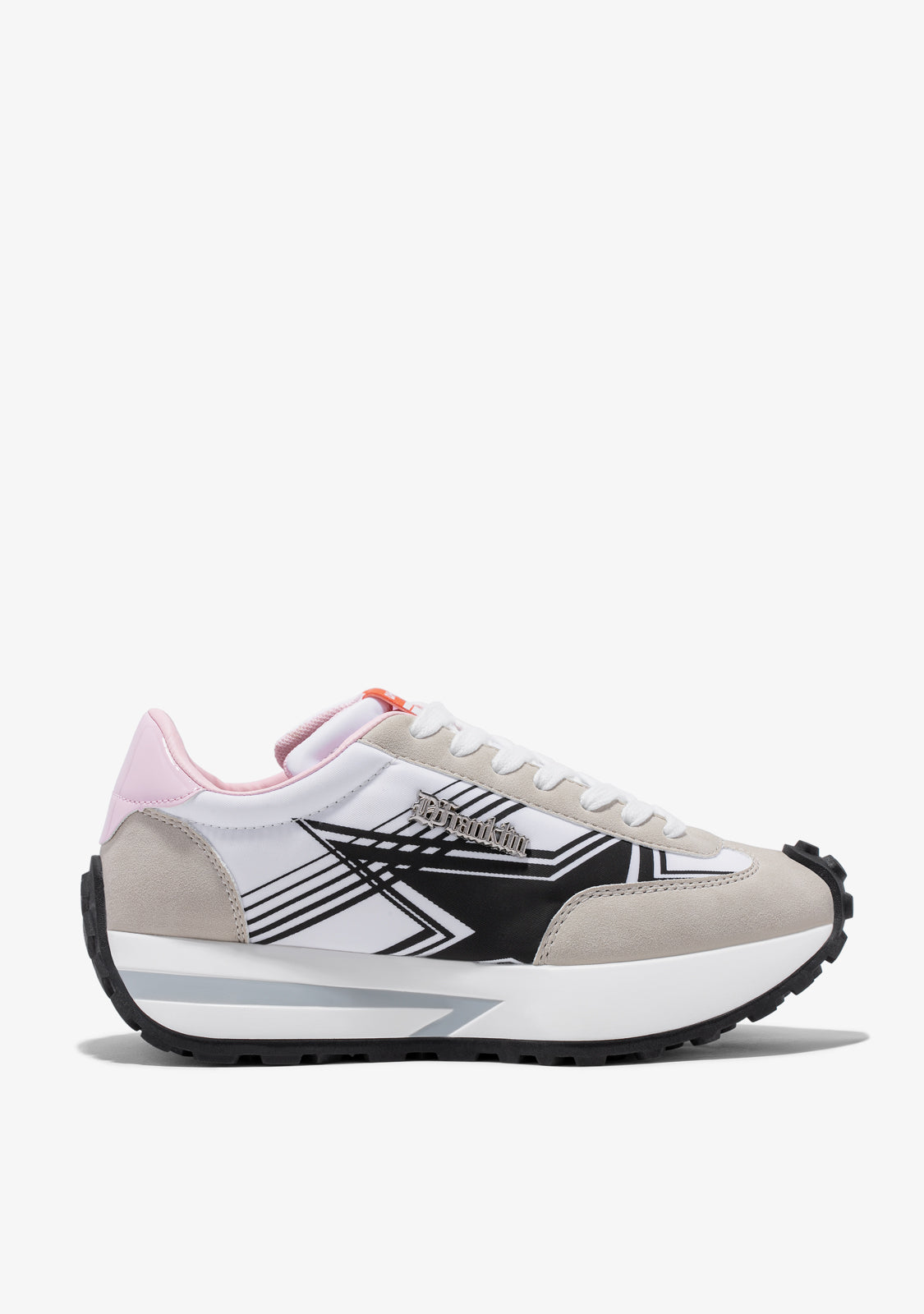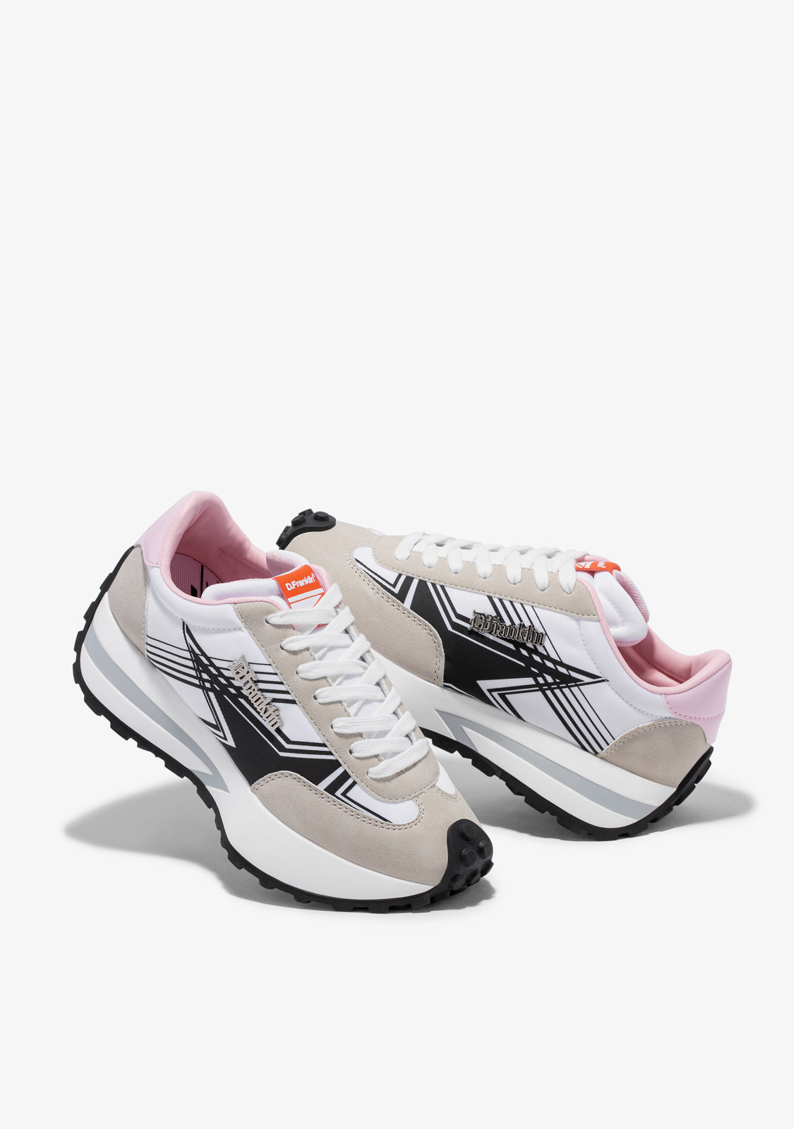 Sneaker ispirate dal ritmo della città. Design alla moda realizzato con materiali cruelty-free. Stampa a stelle nere sul lato. Dettaglio in metallo placcato D.Franklin. Piattaforma bianca di 4 cm. Suola speciale in TR antiscivolo nera.