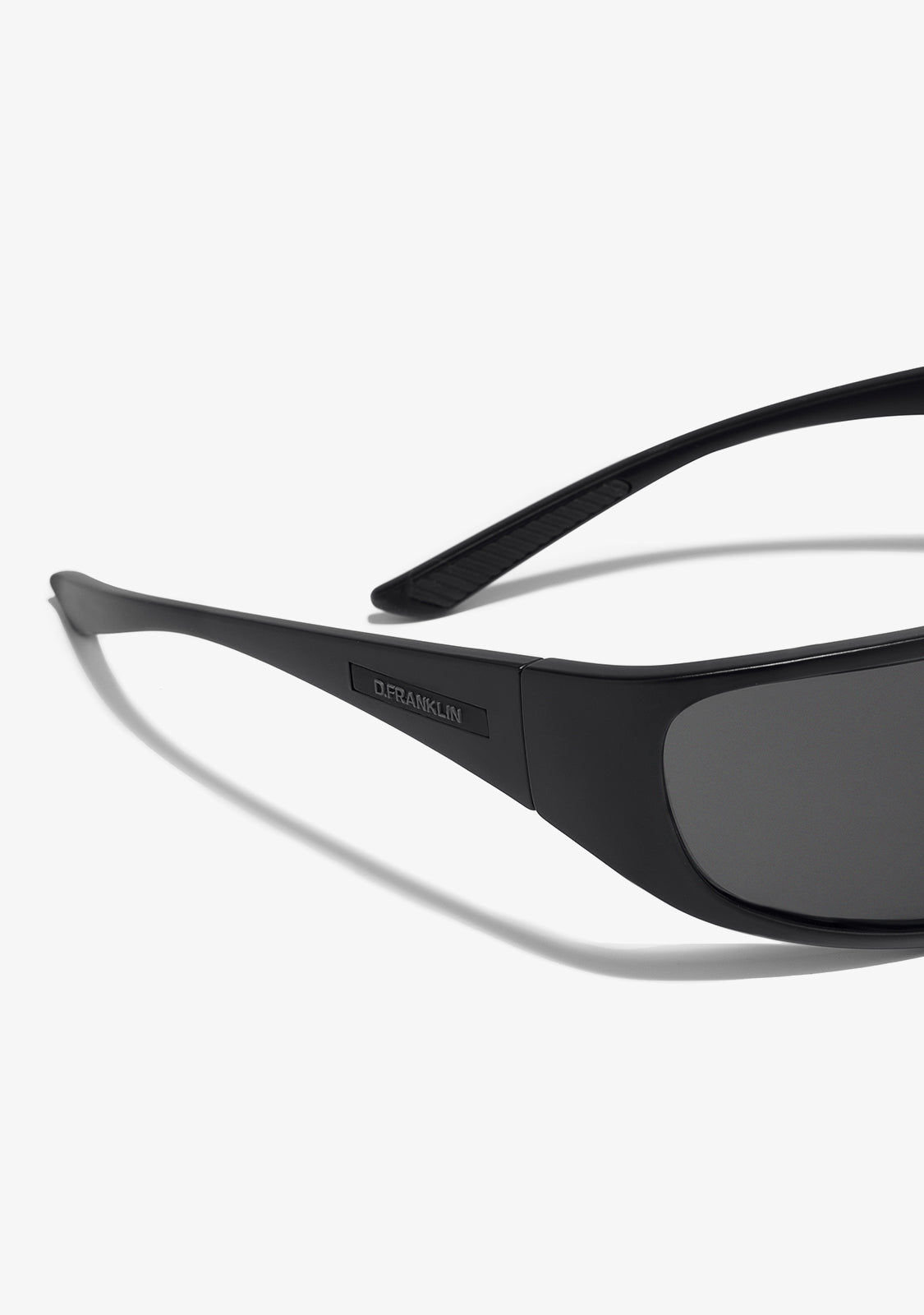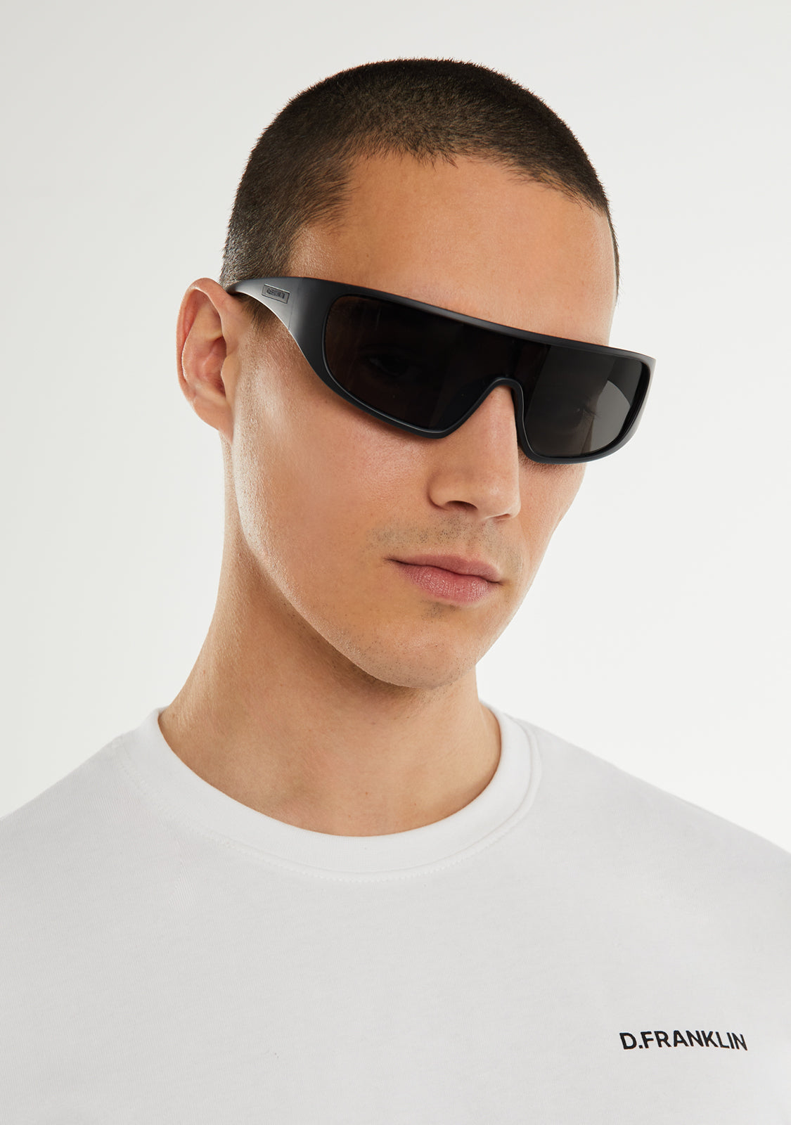 Questo modello presenta una montatura nera opaca con un'estetica curvata. Ha lenti fumé e il nostro emblema distintivo sul lato delle astine. La larghezza uniforme delle lenti di 131 mm e il frontale di 145 mm sono uniti da un'astina di 130 mm.