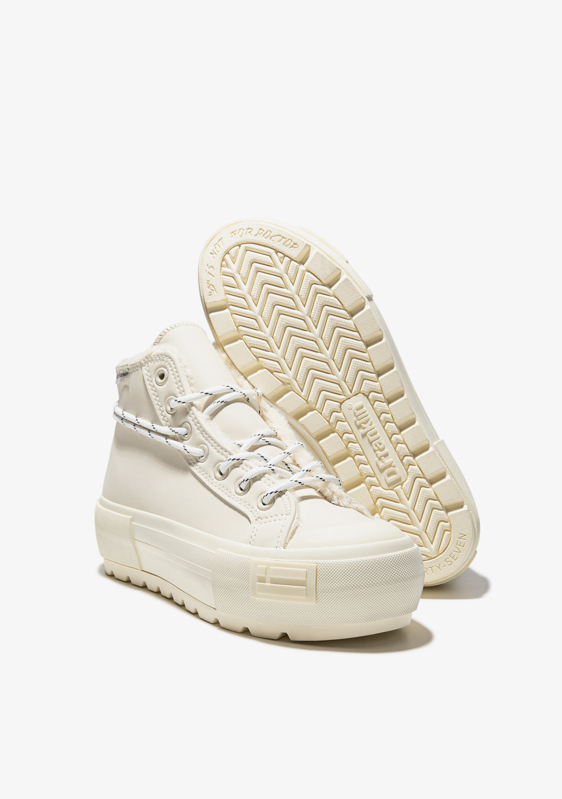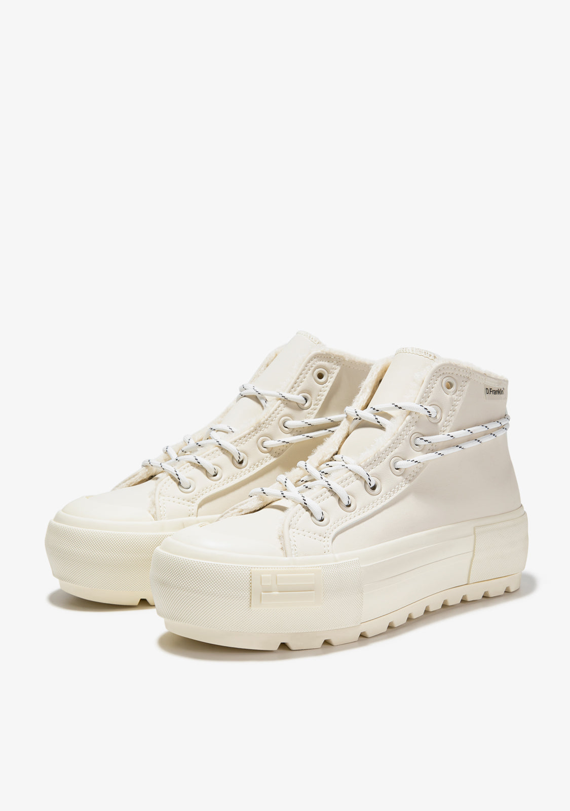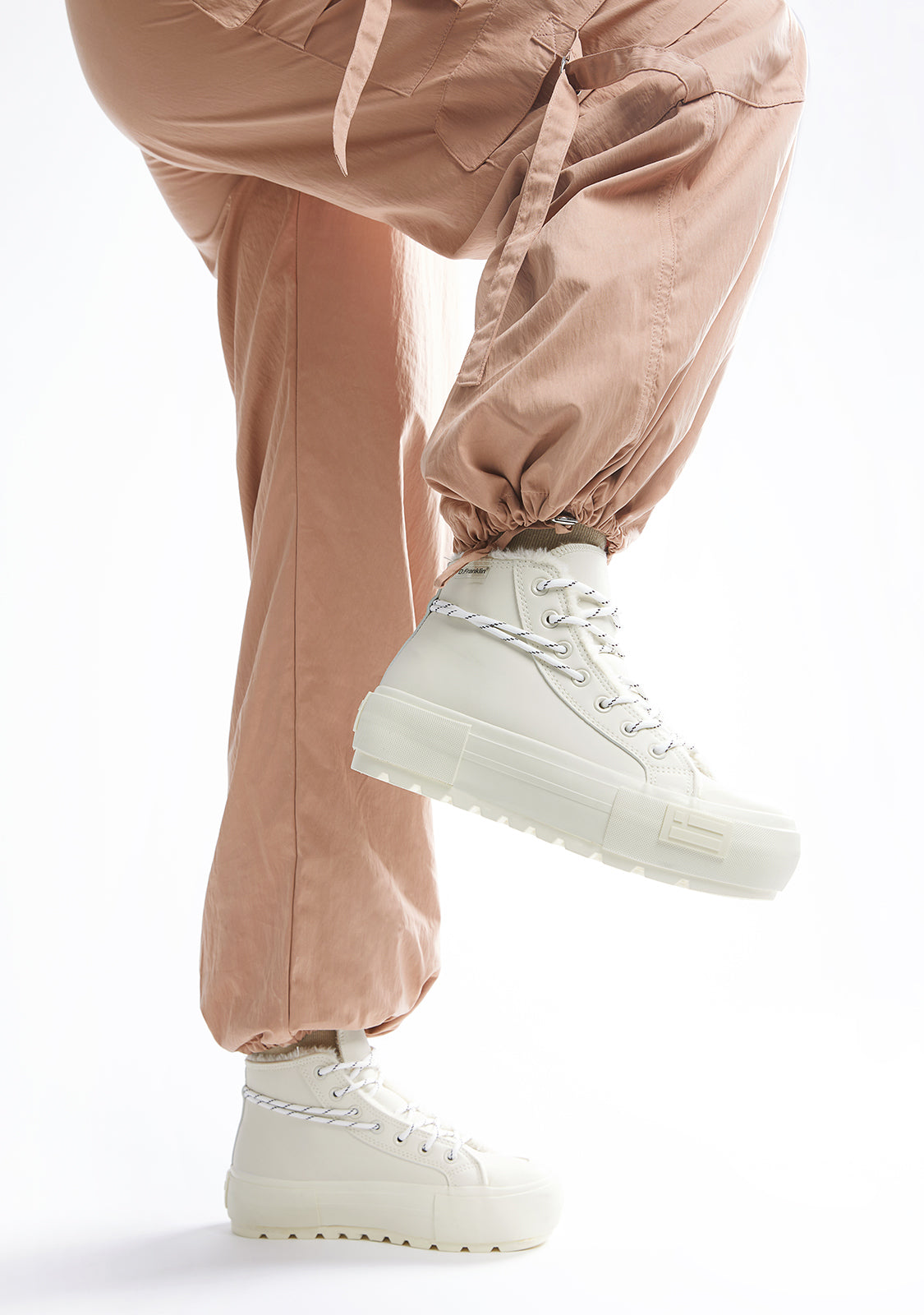 Le nostre sneakers con pelliccia interna fondono comfort e calore in un stivaletto beige. Lacci multi-posizione per un'estetica urbana e una vestibilità perfetta. La suola di 5 cm presenta il nostro emblema sia sul tallone che sulla parte anteriore del piede.