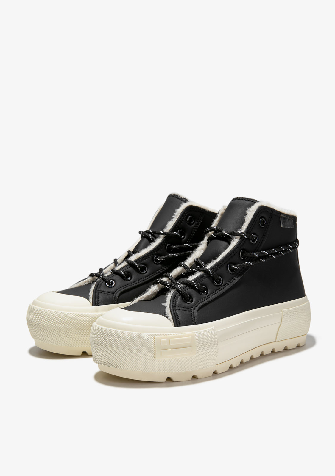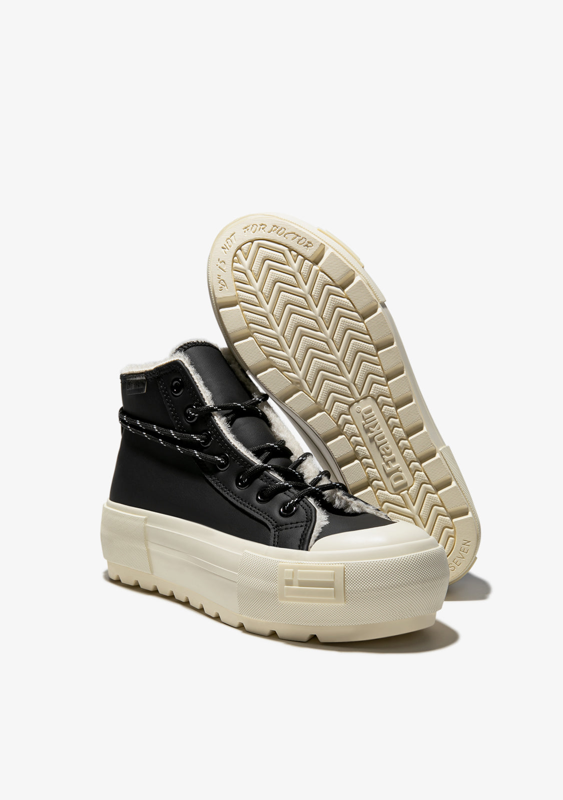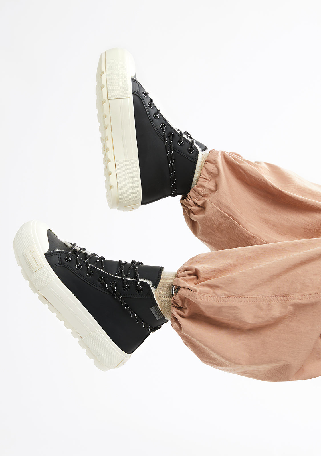 Le nostre sneaker con pelliccia interna fondono comfort e calore in un stivale alla caviglia nero. Lacci multi-posizione per un'estetica urbana e una vestibilità sicura. La suola di 5 cm presenta il nostro emblema sia sul tallone che sulla parte anteriore del piede.