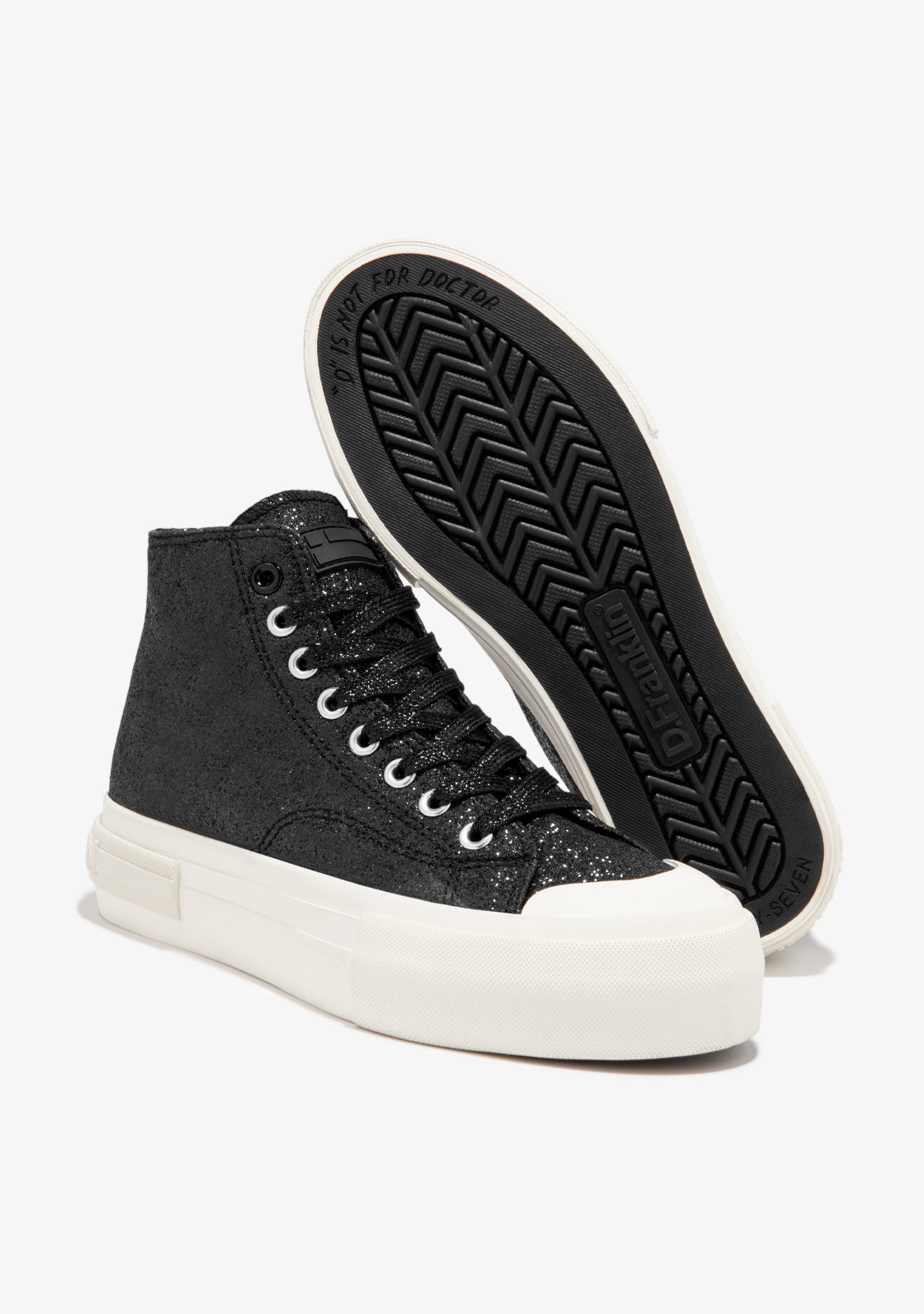Questo modello alto presenta un'estetica nera lucida. La suola in gomma bianca è alta 4 cm. Presenta anche lettere personalizzate sul tallone.