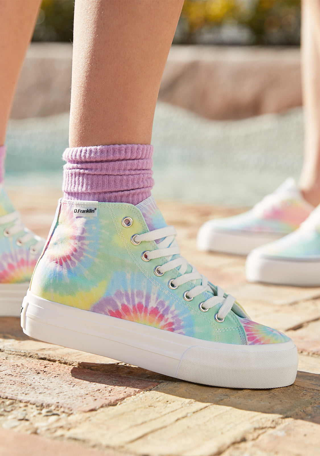 La collezione più amata della stagione è tornata. La One Way edizione limitata è ispirata alle collezioni più casual, combinata con la personalità e lo stile di D.Franklin®. Le One Way Tie Dye sono le sneakers hi-top perfette per tutti i tipi di nuovi percorsi. Un modello di street style che combina le tendenze attuali con una finitura colorata Tie Dye, insieme alle finiture e ai dettagli più originali.