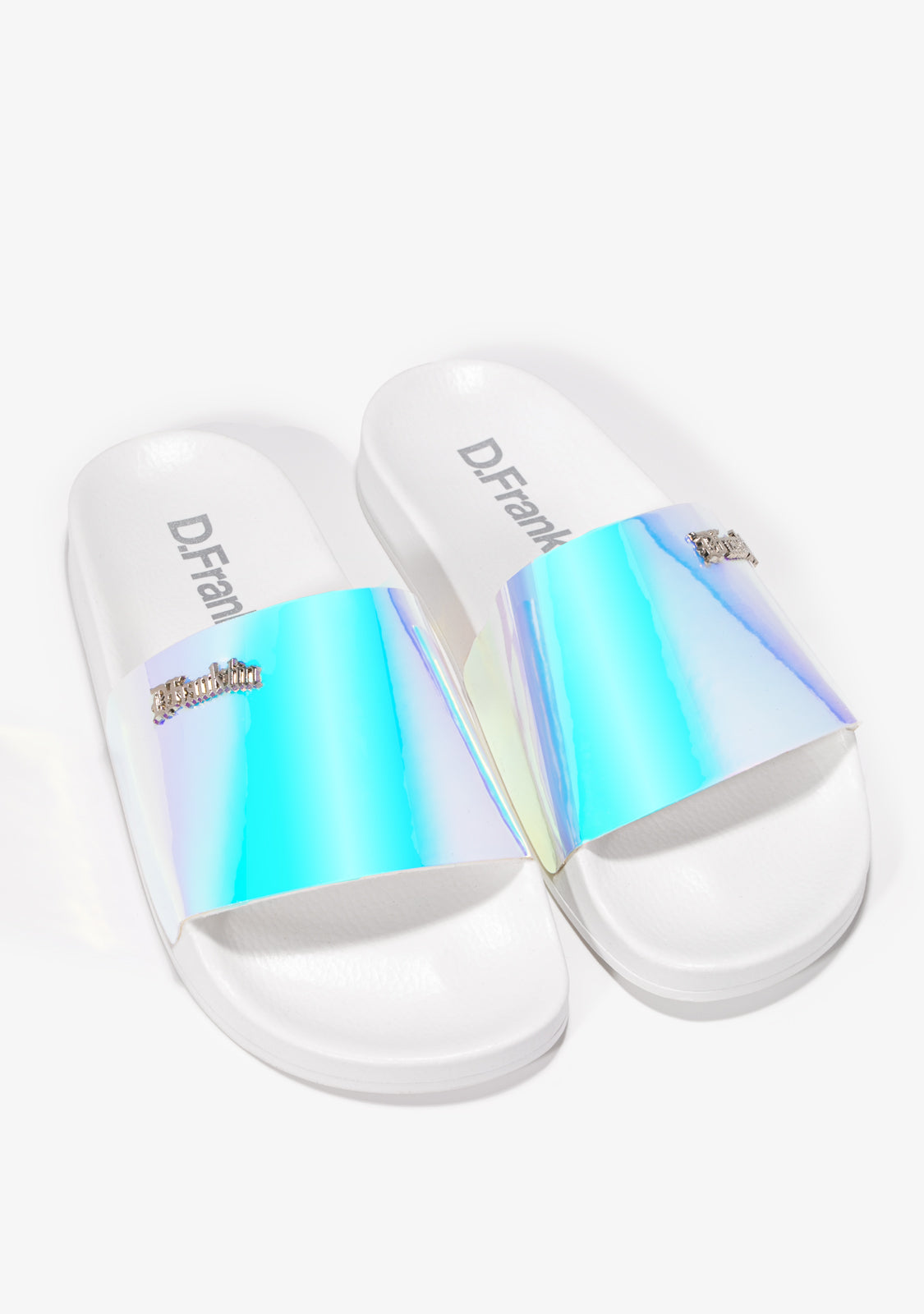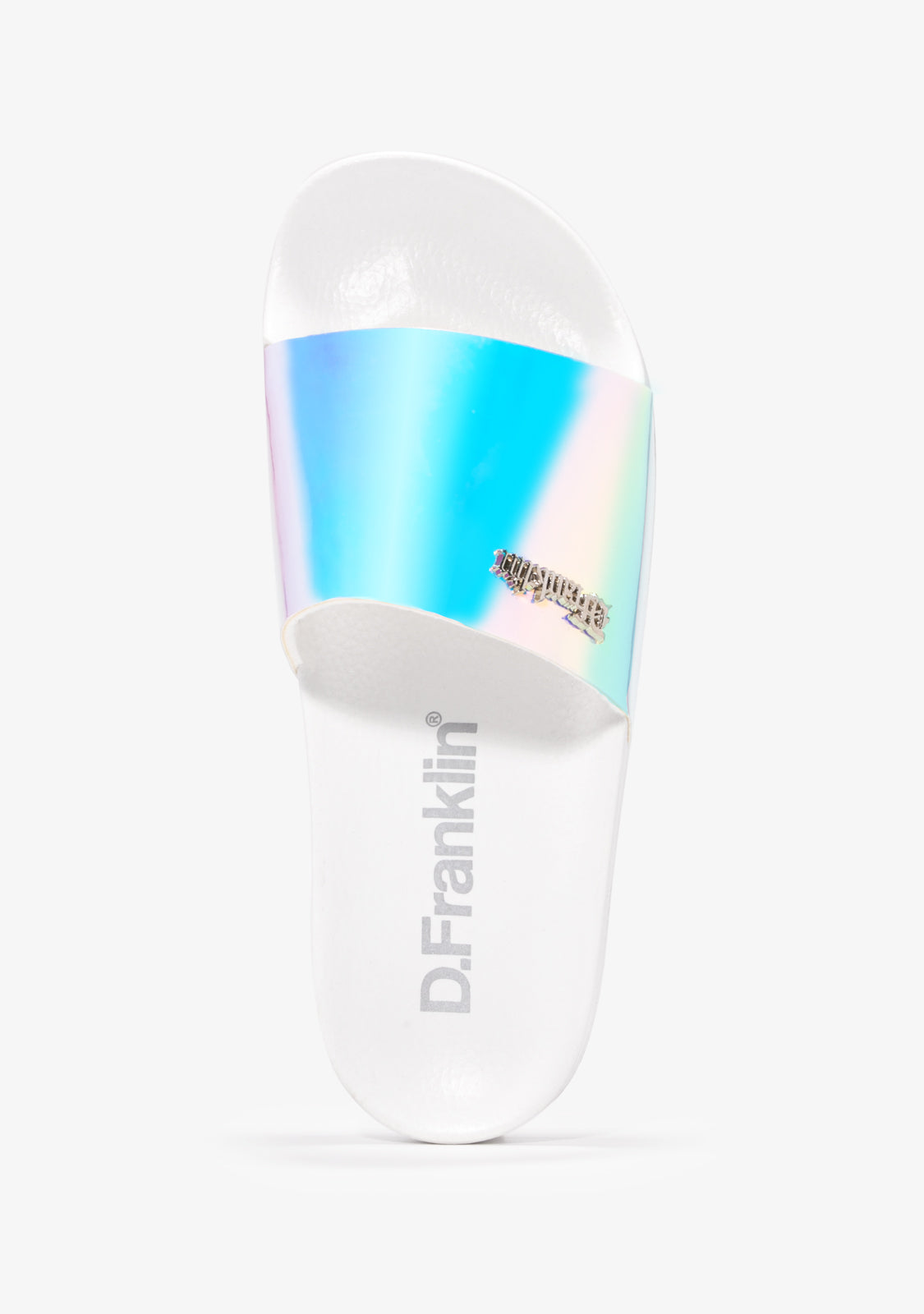 I sandali D.Franklin Pala Slide Patent presentano una larga cinghia sintetica con effetto iris che garantisce supporto. Presentano anche il nostro emblema D.Franklin sulla parte superiore. Il design della suola è modellato per adattarsi perfettamente alla forma del piede.