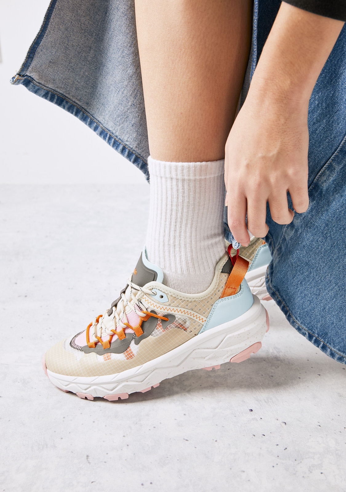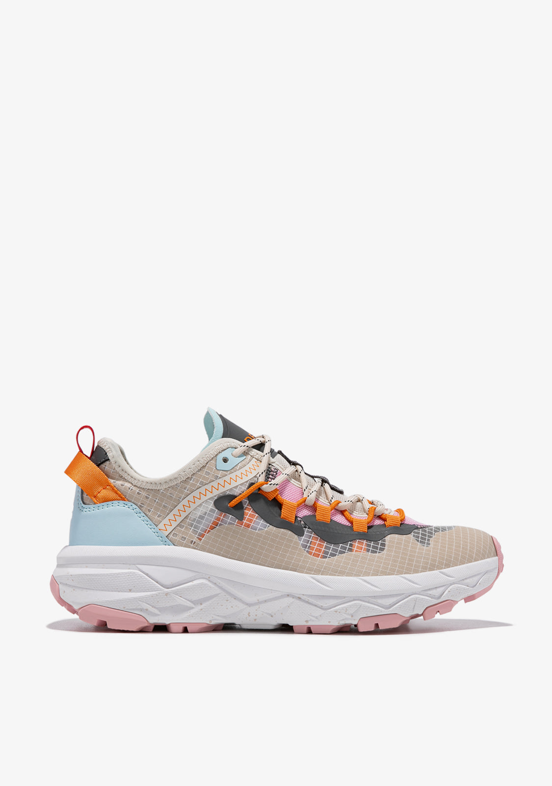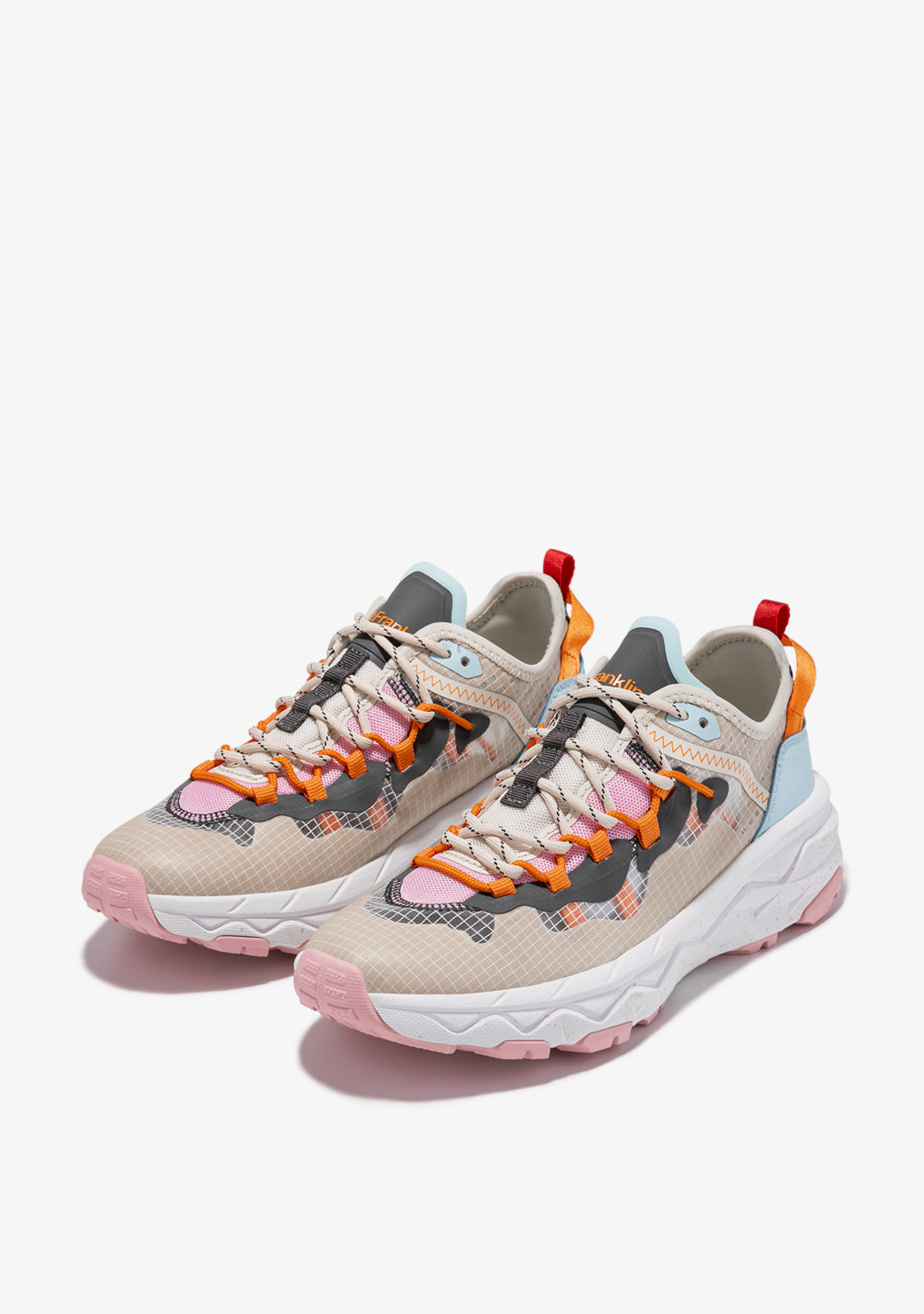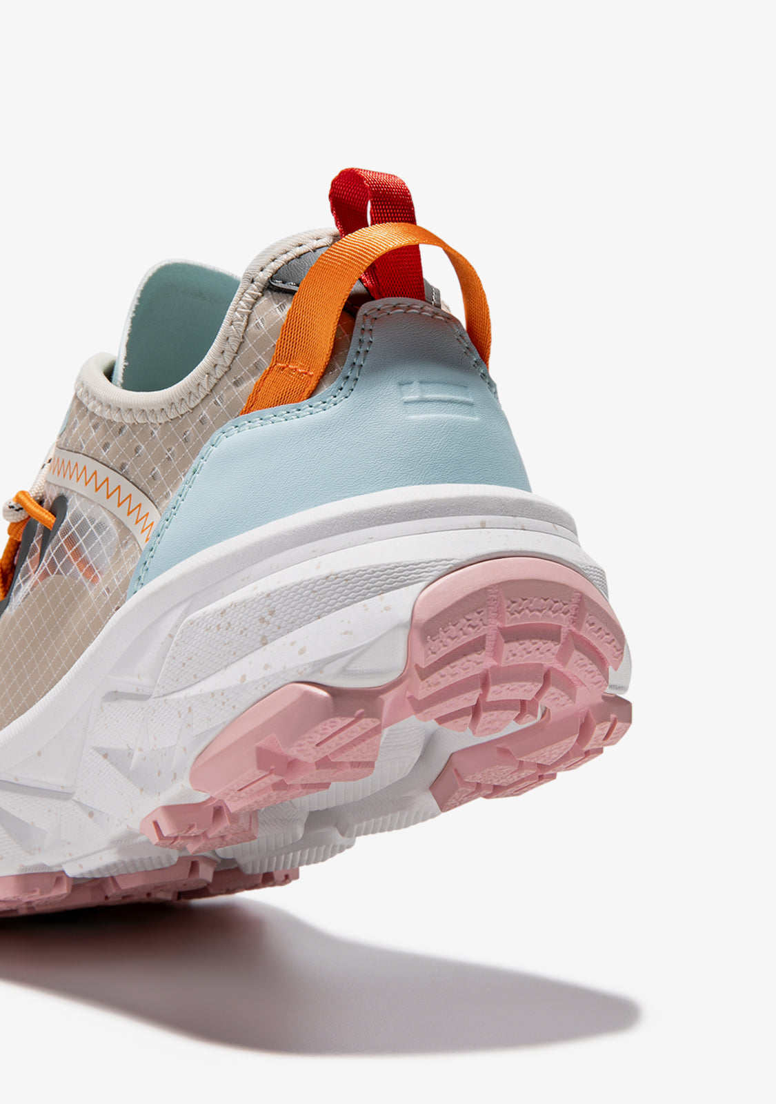 Abbiamo fuso il carattere sportivo in una scarpa con una finitura lucida. Una costruzione tecnica realizzata con stampa e rete in tonalità di beige, arancione e blu. Questo design presenta una suola in poliuretano leggera con tasselli TR per una buona aderenza e trazione.