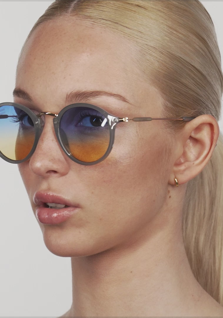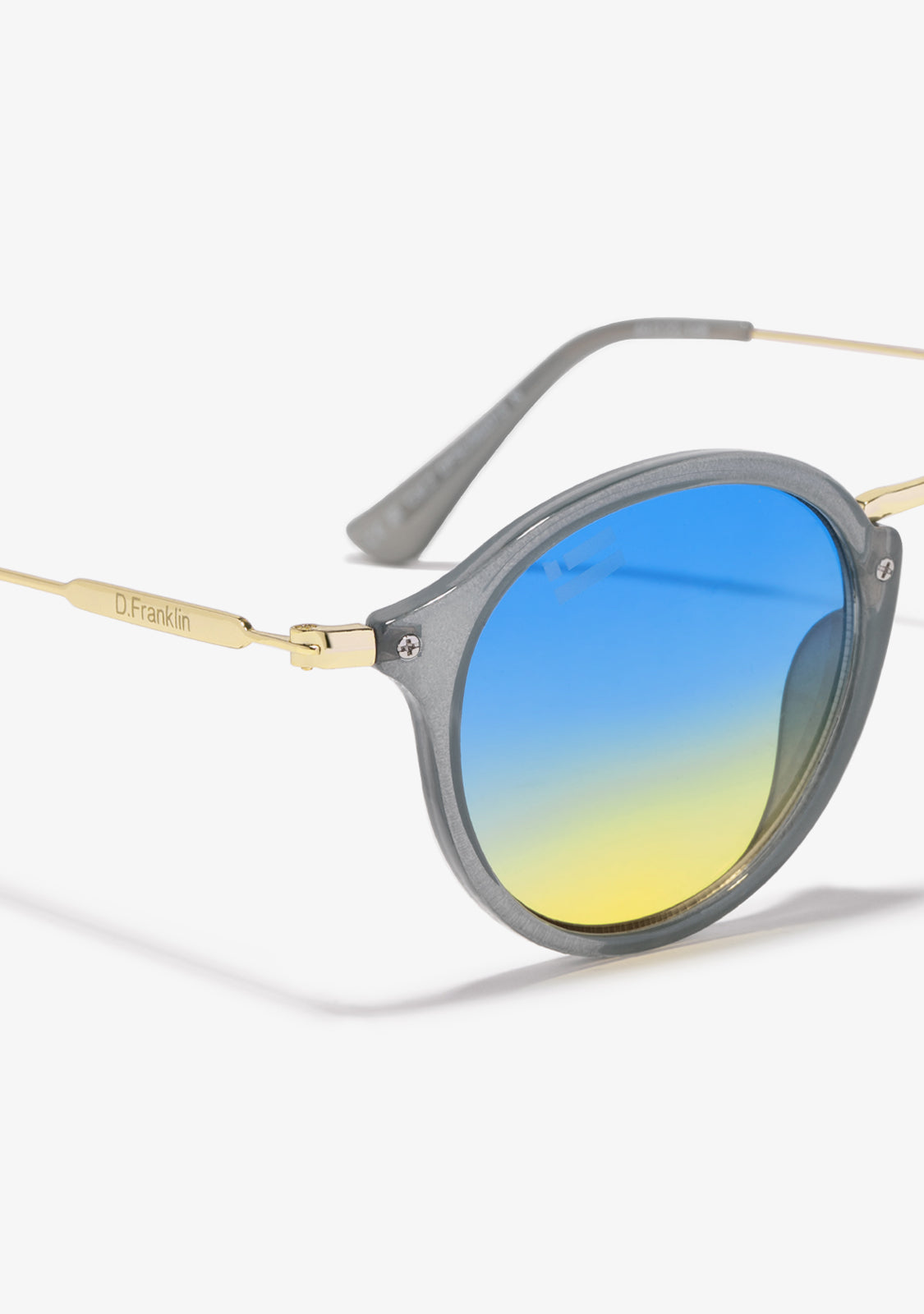 Lenti blu arrotondate e tonalità del telaio abbinate rinforzano il look anni settanta di questo modello. Presenta i dettagli D.Franklin: il logo inciso su entrambe le astine in metallo e il nostro emblema sulla lente destra. Con una larghezza della lente di 49 mm e un frontale di 148 mm, questi occhiali si adattano alla maggior parte dei volti. Le astine laterali sono lunghe 145 mm.