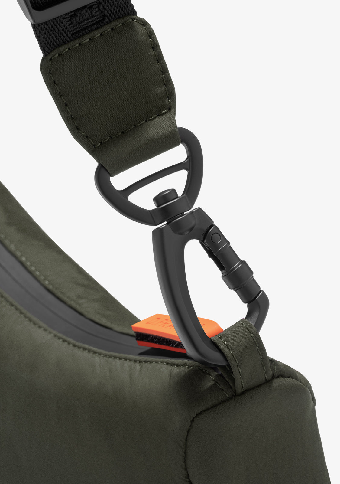 Questo design con finitura verde è realizzato in materiali tecnici che lo rendono leggero e resistente. L'interno presenta una tasca con zip e due piccoli scomparti per l'organizzazione.