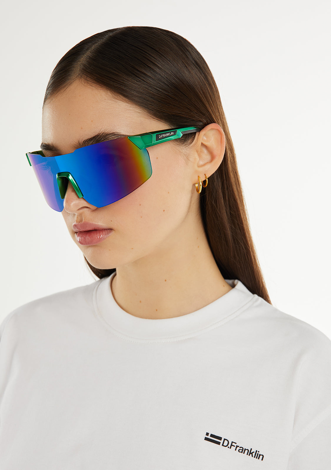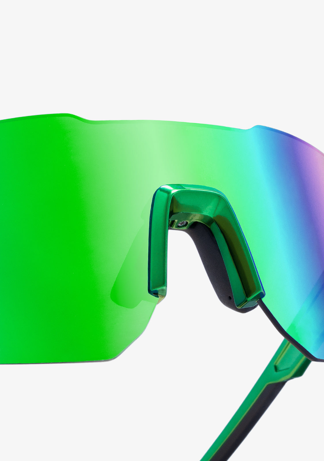 Occhiali da sole specchiati con estetica high-tech. Immergiti in un design curvo ispirato alla velocità delle onde. Occhiali aerodinamici creati per dare una nuova forma al tuo stile.