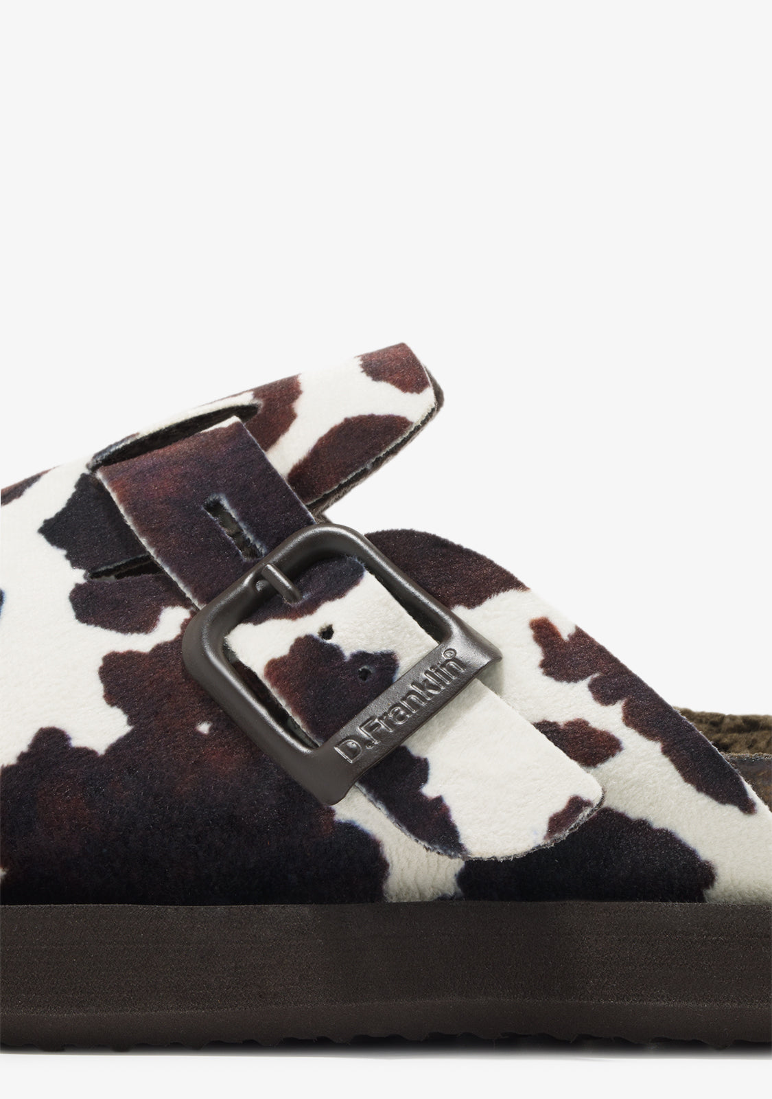 Le Vibe Clog Cow di D.Franklin propongono un design originale con una stampa mucca in bianco e nero, perfette per chi cerca una scarpa con personalità e originalità. Realizzate in Spagna, si distinguono per qualità e comfort.
