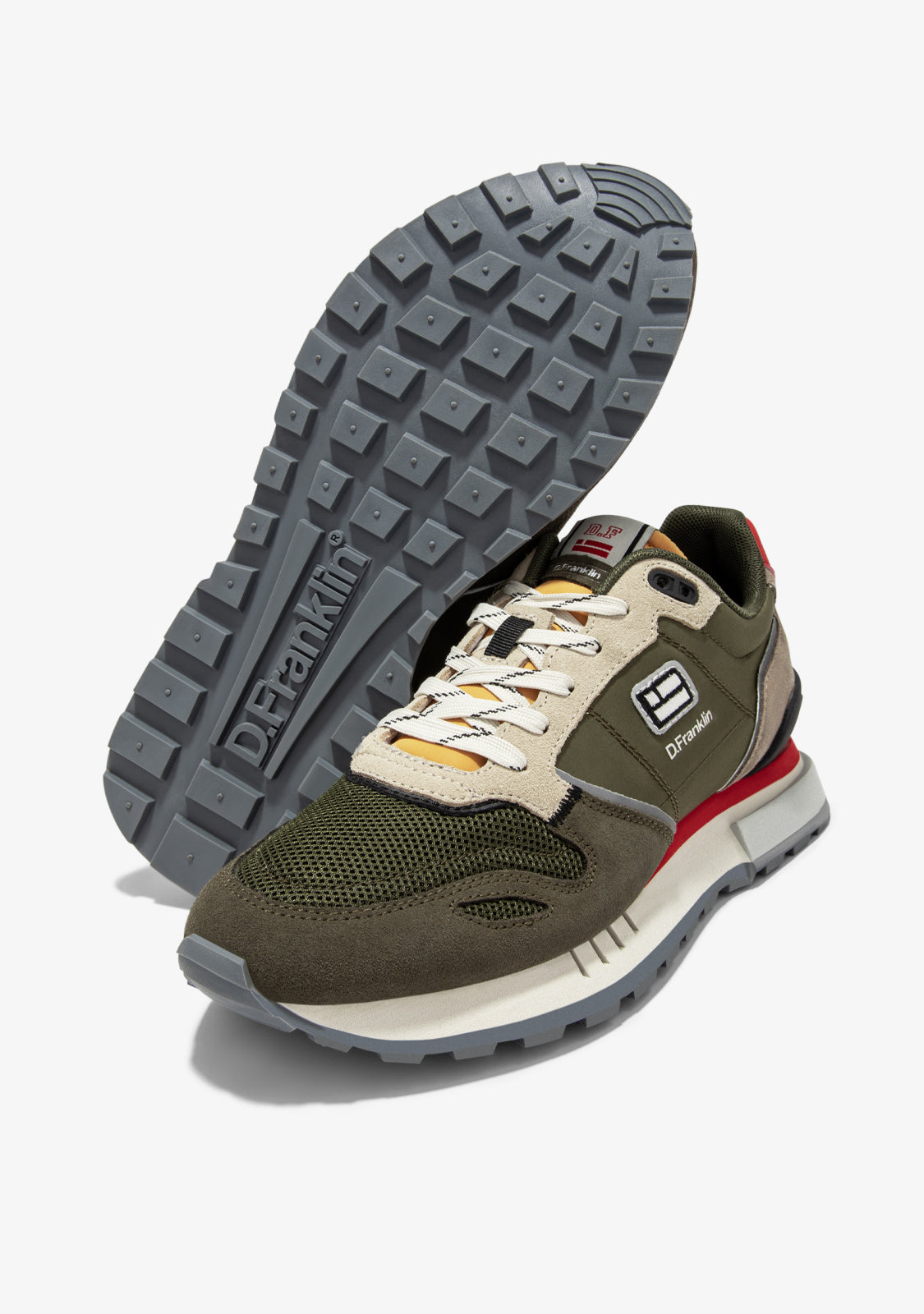 Queste sneakers sono realizzate con dettagli in khaki, rosso e nero. Presentano anche lacci stampati. Hanno una suola in TR e una suola a piramide per un maggiore comfort e aderenza. L'area delle dita ha un pezzo misto per una maggiore flessibilità. Il nostro emblema si trova sulla parte anteriore e laterale, così come sul retro.