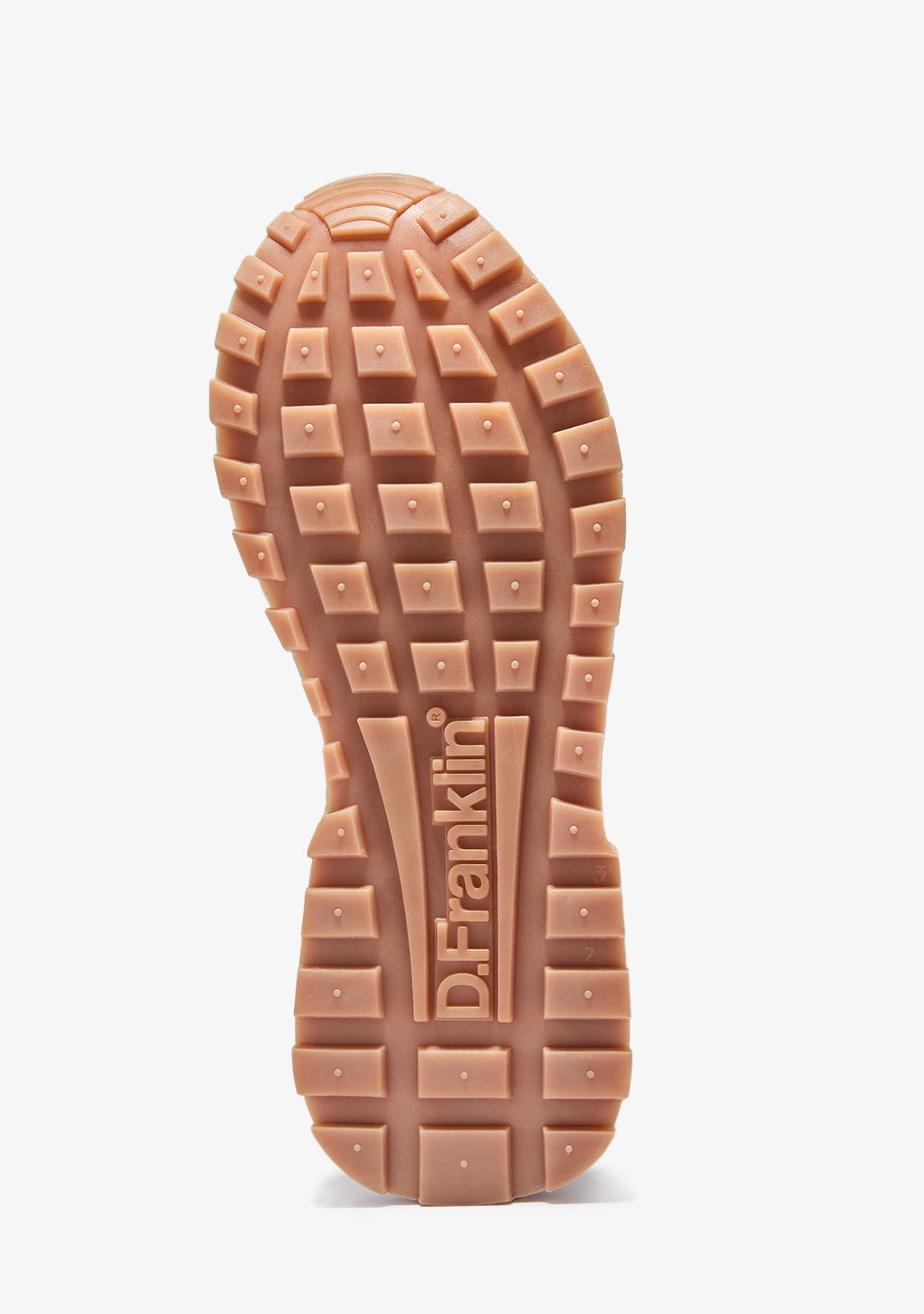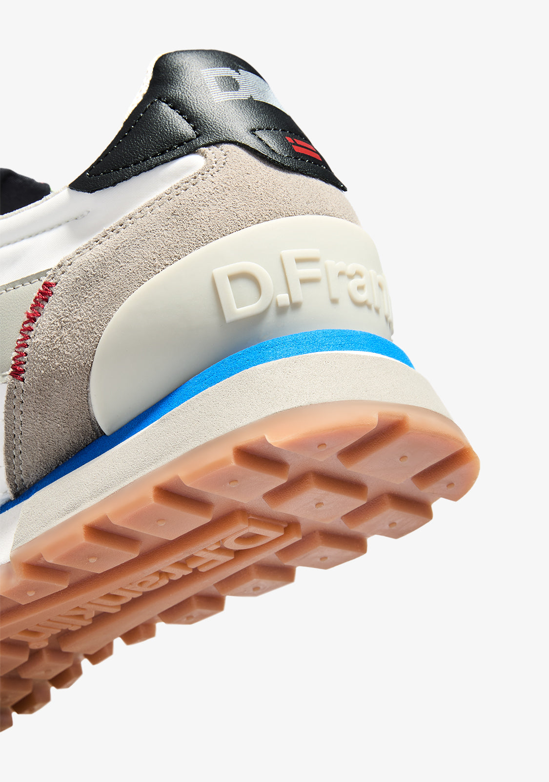 Presentano una suola in EVA e TPR per una sensazione più leggera e un passo confortevole, offrendo trazione stabile nei movimenti di ogni giorno. Il nostro emblema è posizionato sul frontale, sul lato e sul tallone, e la suola include un battistrada personalizzato ispirato alla bandiera D.Franklin.